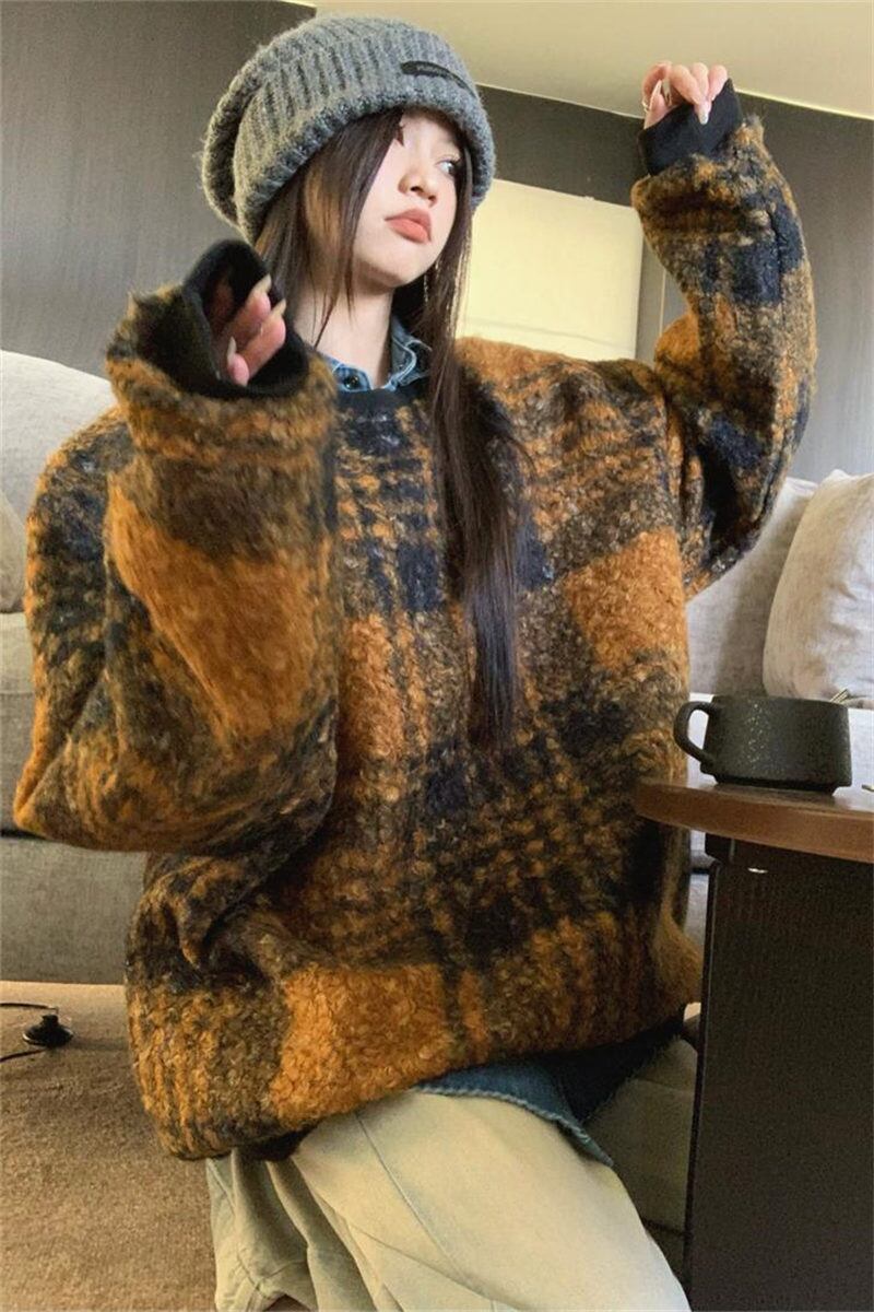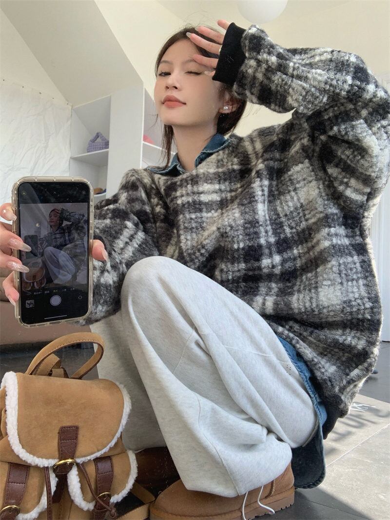 2023年冬新作 レトロ レイジー風 合わせやすい チェック柄 長袖 トレーナー
