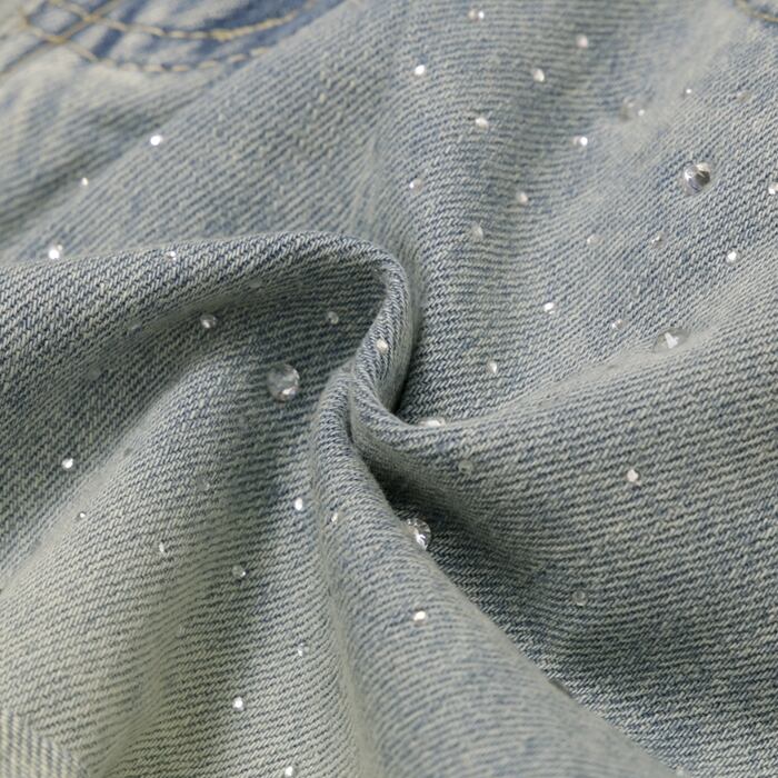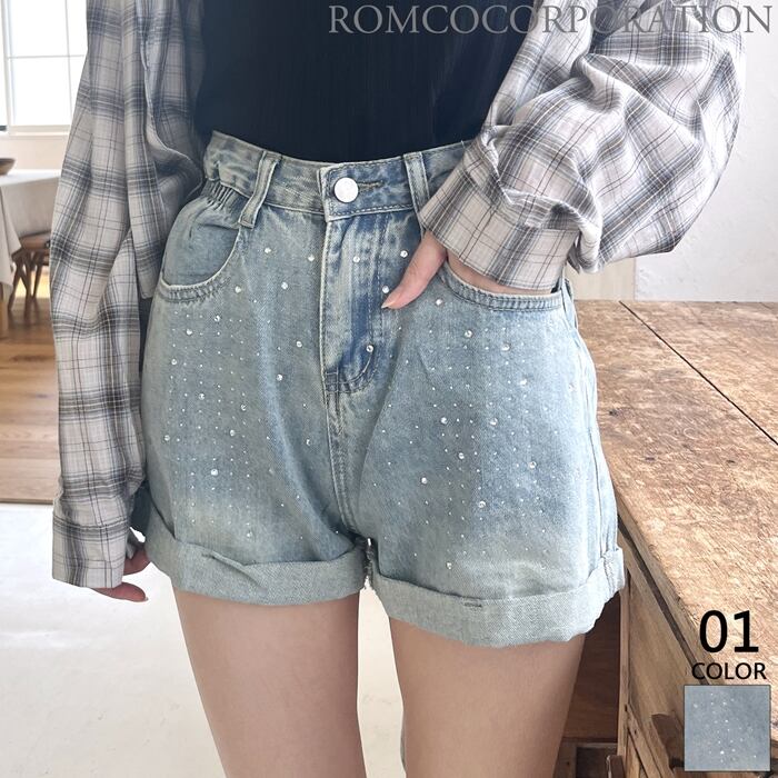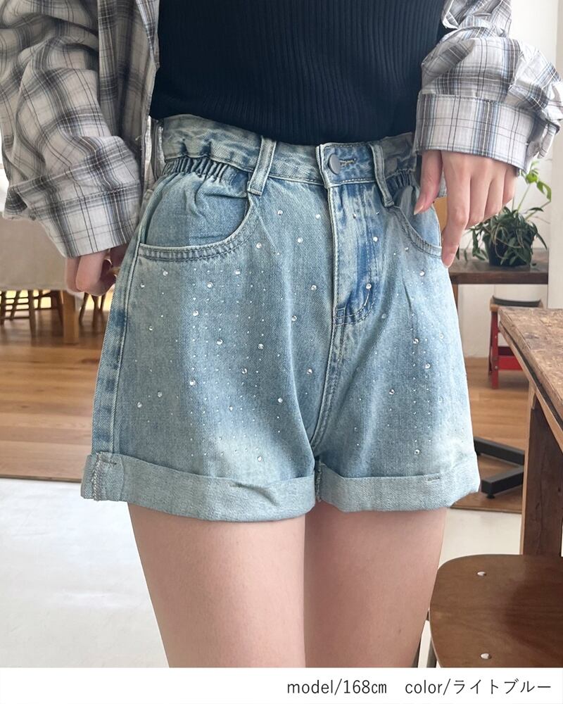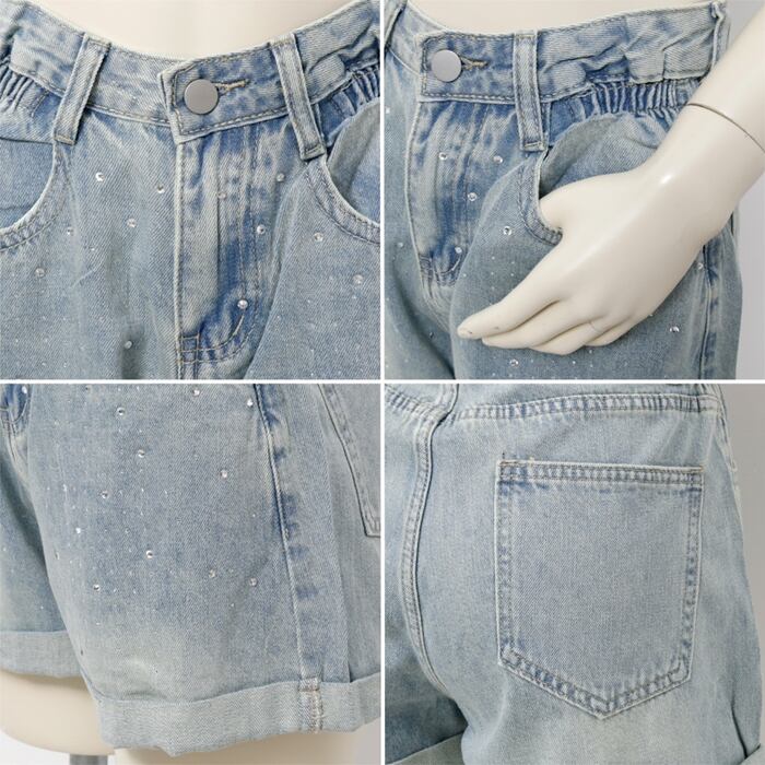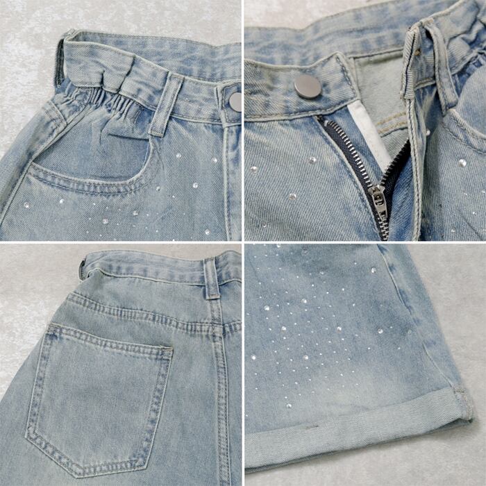 【2024新作商品♪】ラインストーン付きロールアップデザインデニムショートパンツ