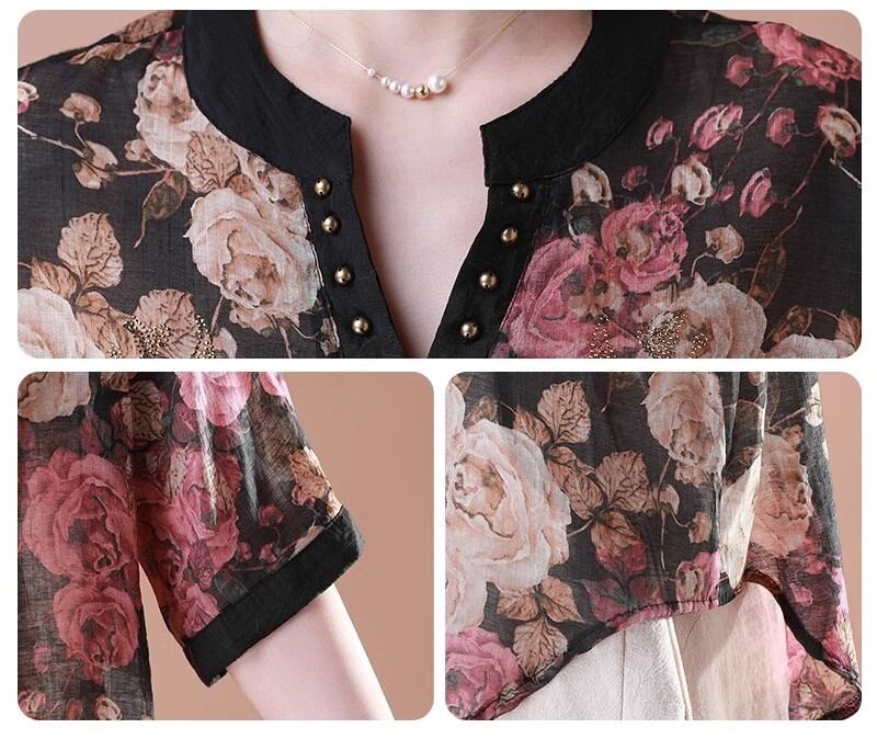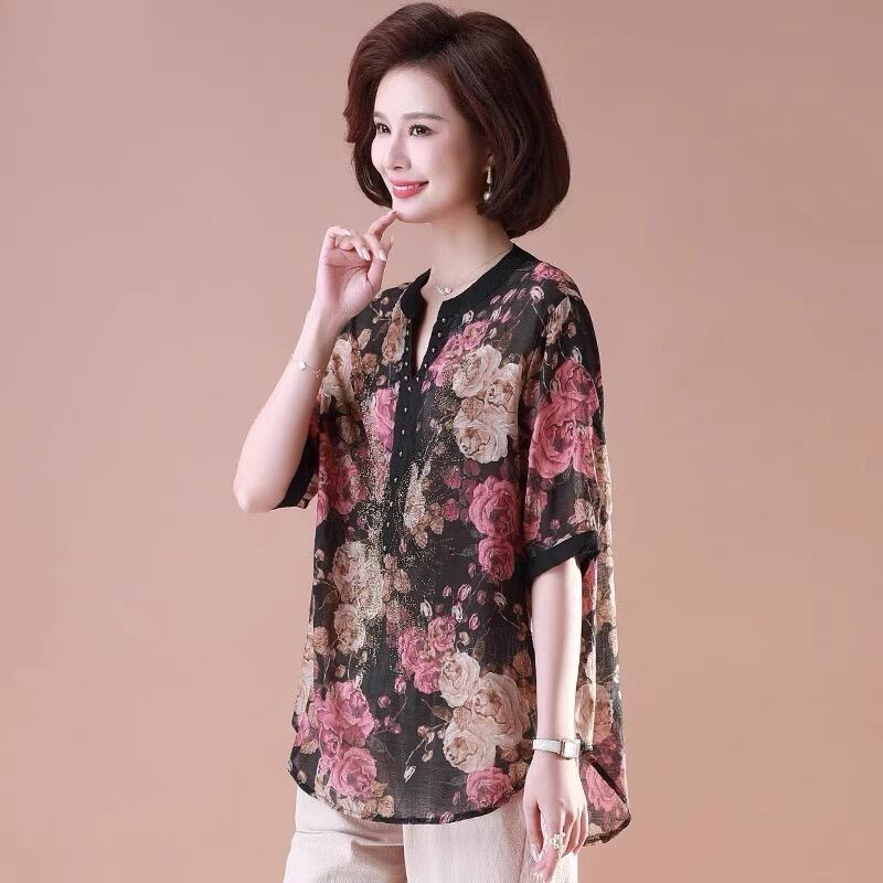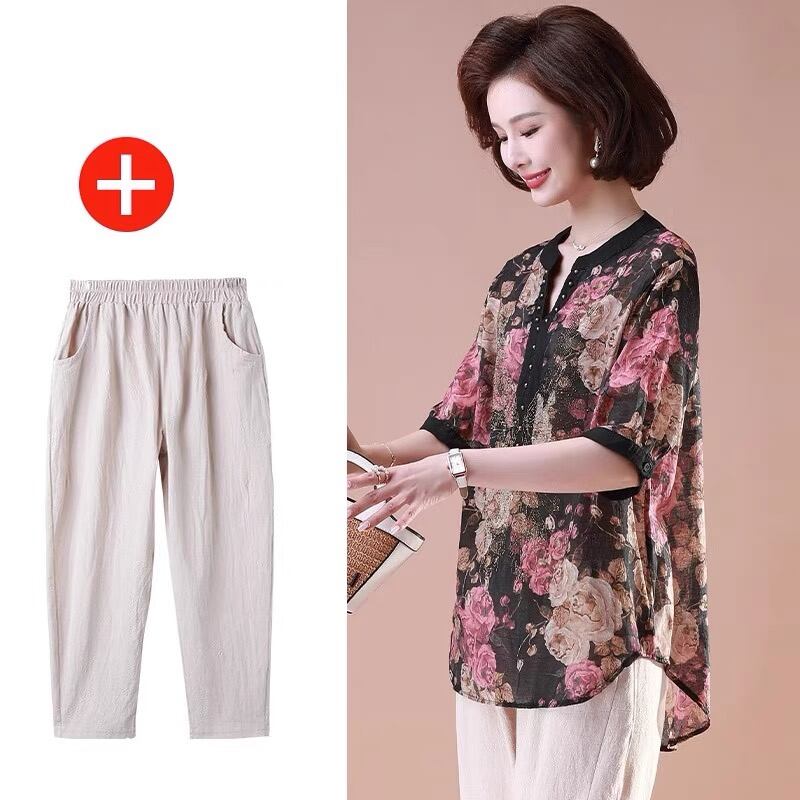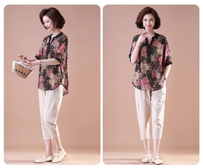 初回送料無料 夏レディースファッション カジュアル プリント シフォン シャツ 七分ズボン
