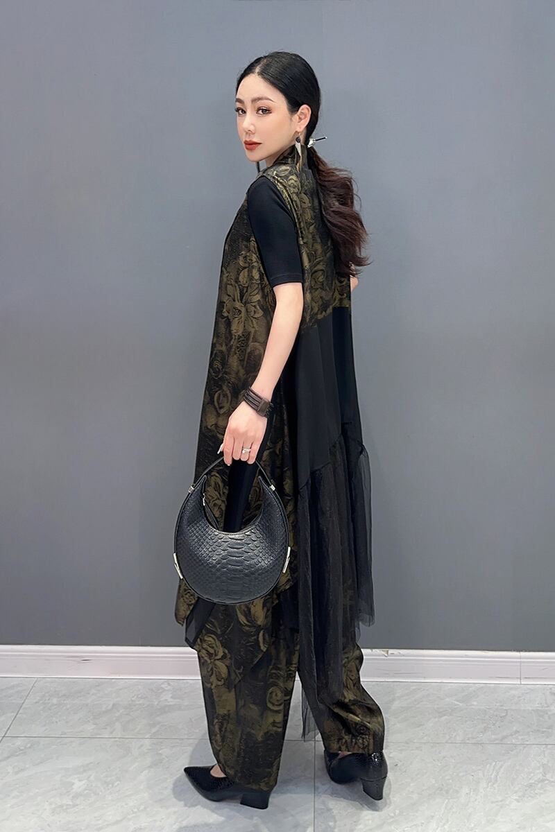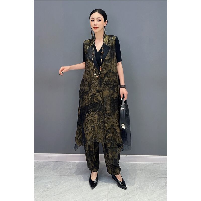初回送料無料 プリントシフォン切り替えロングベストとズボン2枚セット レディースファション商品