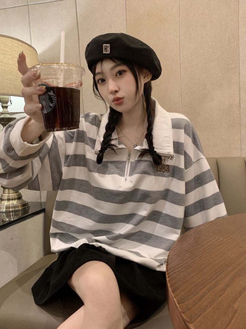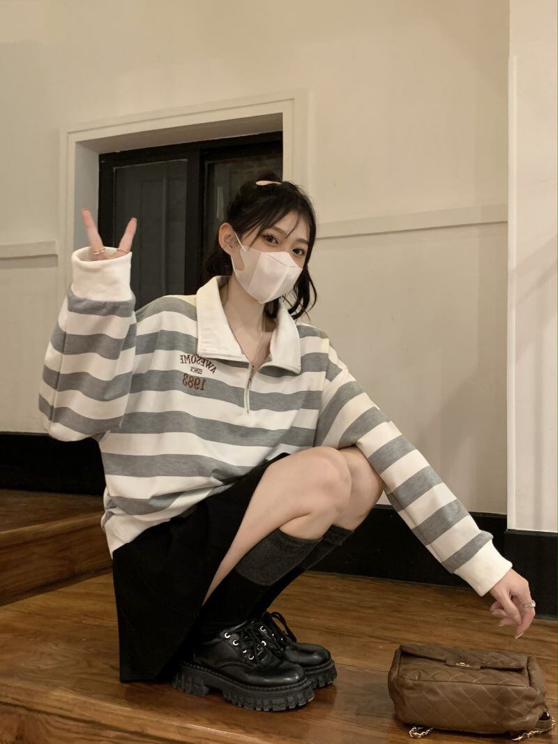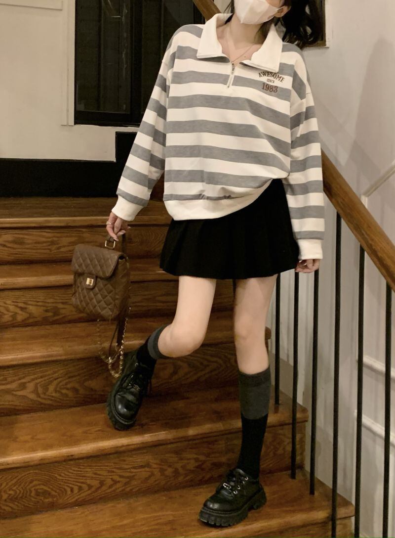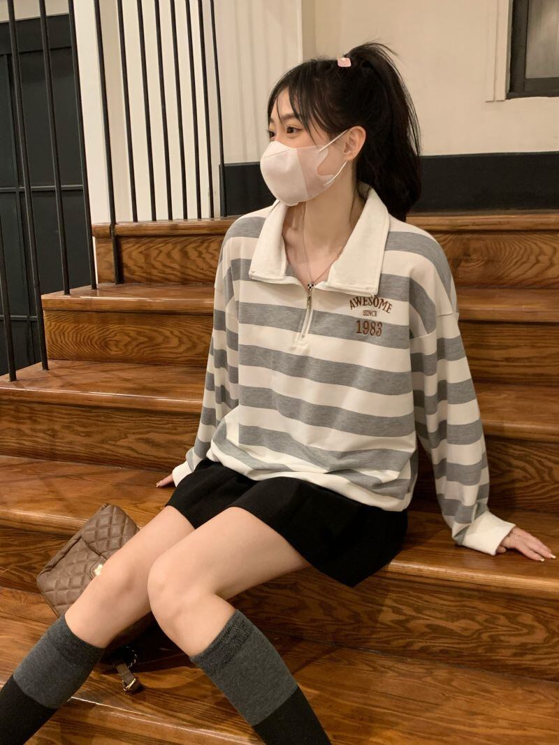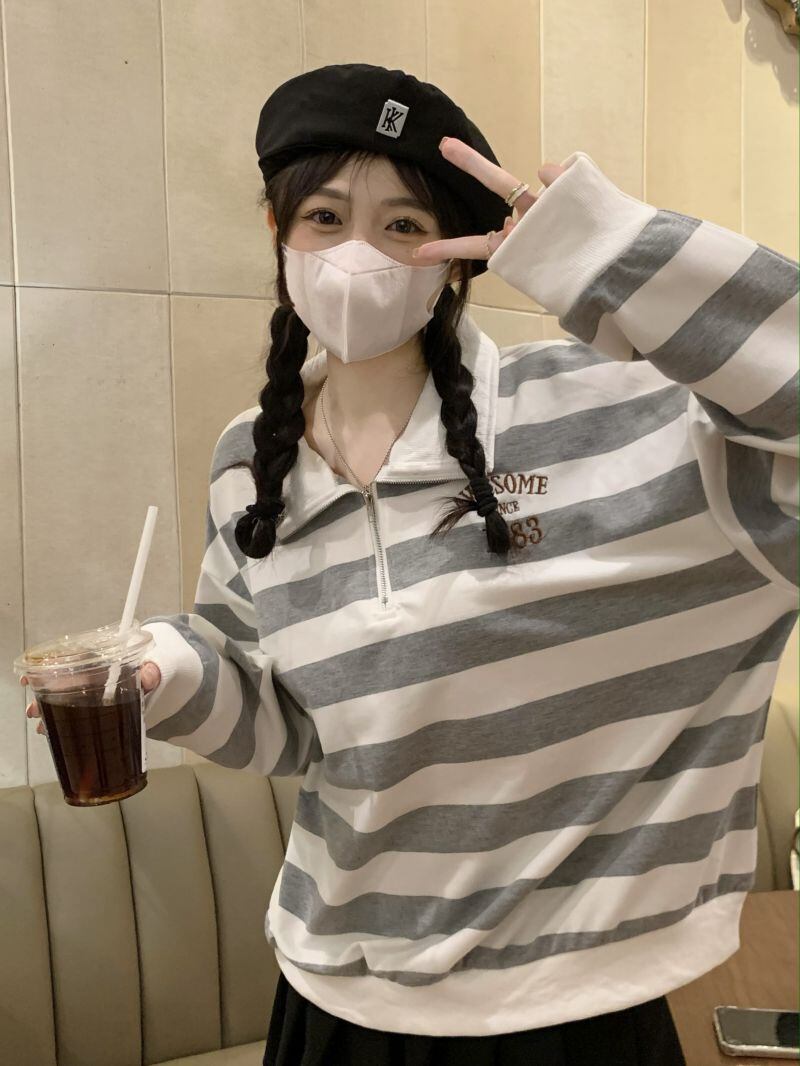 2022冬INS★韓国風 レトロ ストライプ 柄 折り襟 キャンパス ニット セーター