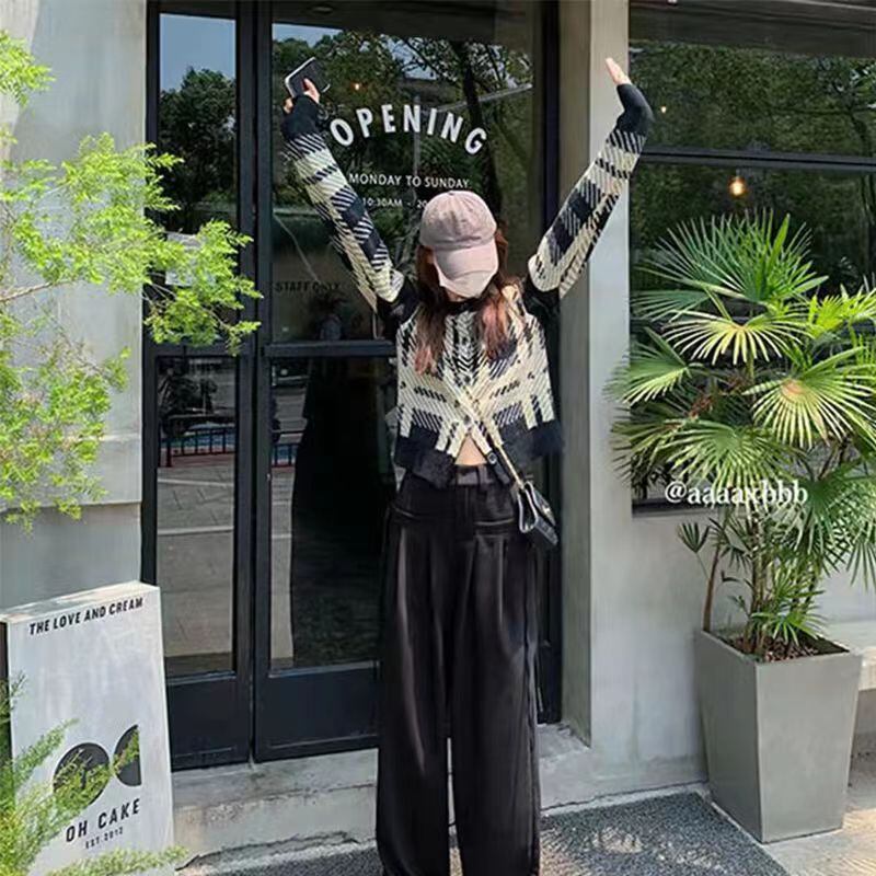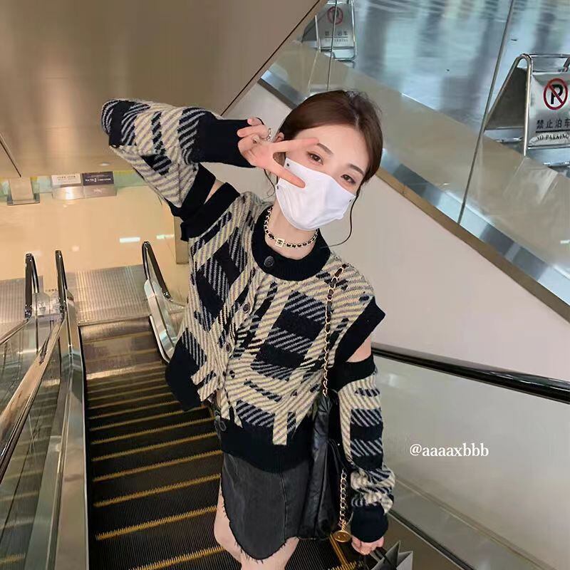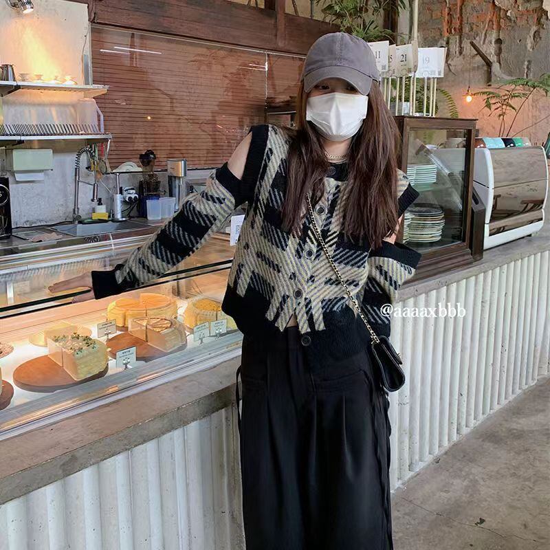 2022冬INS★韓国風 オープンショルダーチェックニット セーター
