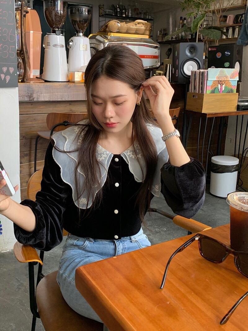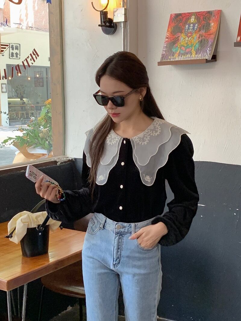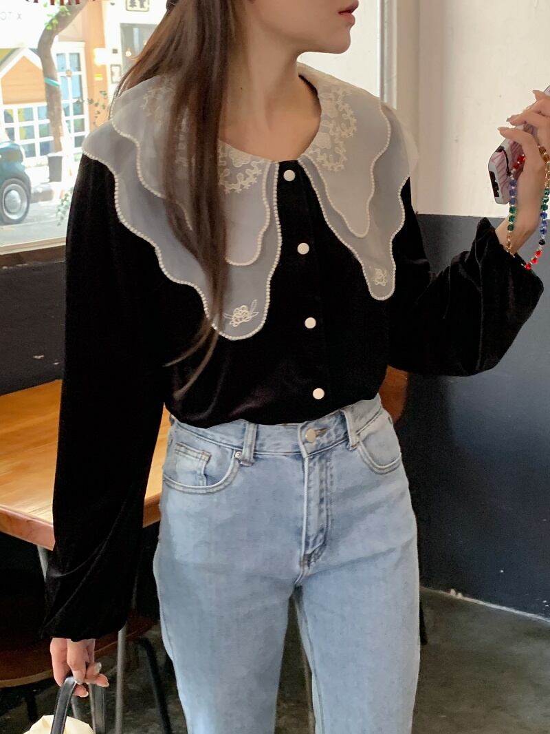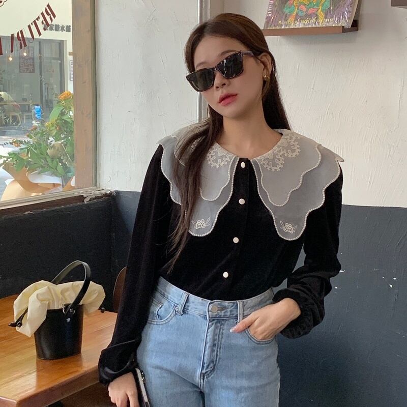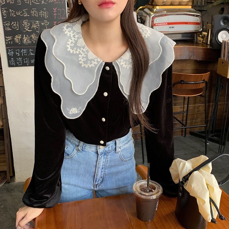 INS 秋冬新作 ins超人気レトロ 気質 折り襟 刺繡飾り チュール生地 シャツ/ブラウス