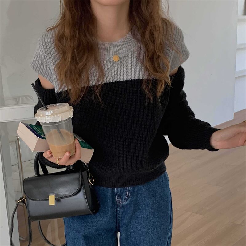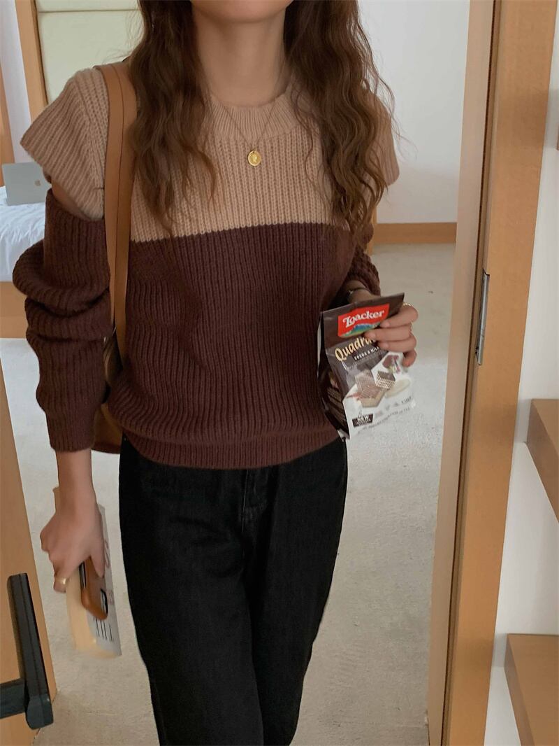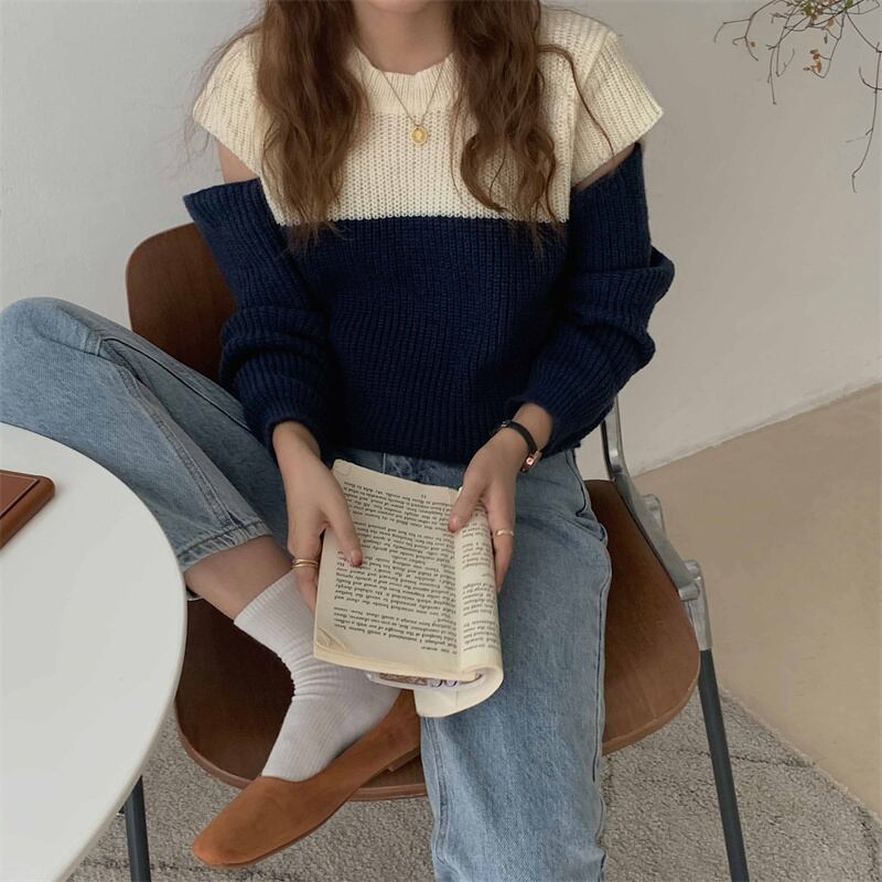 2022冬INS★ファッション超気質 韓国風 ニット スプライス 配色 オフショルダー セータ
