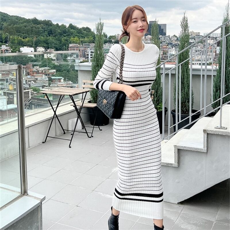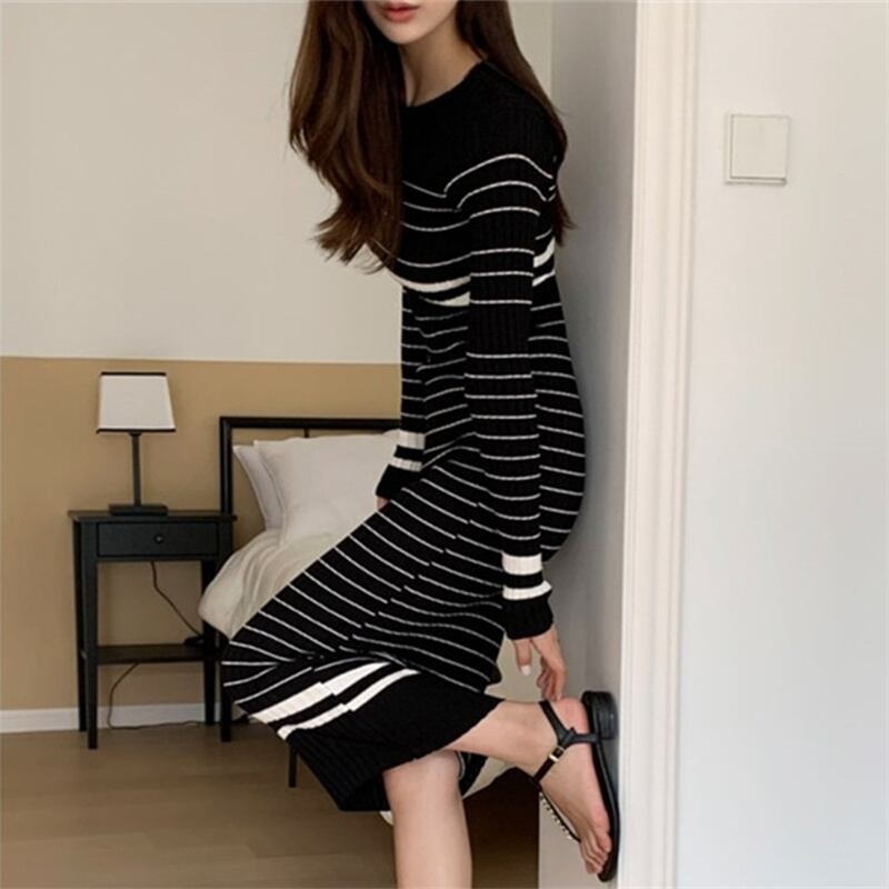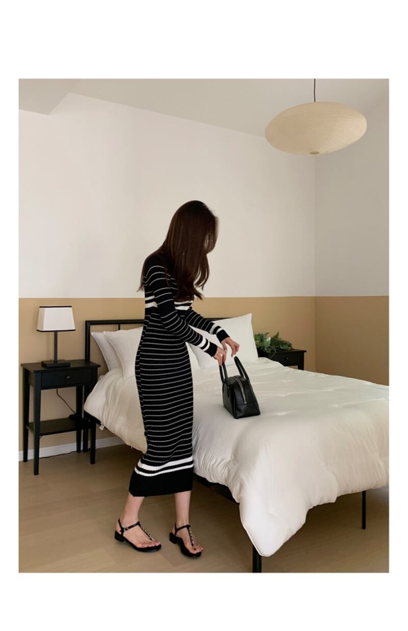 2022冬INS★ファッション レイジー風 ストライプ 柄 ニット タイトワンピース