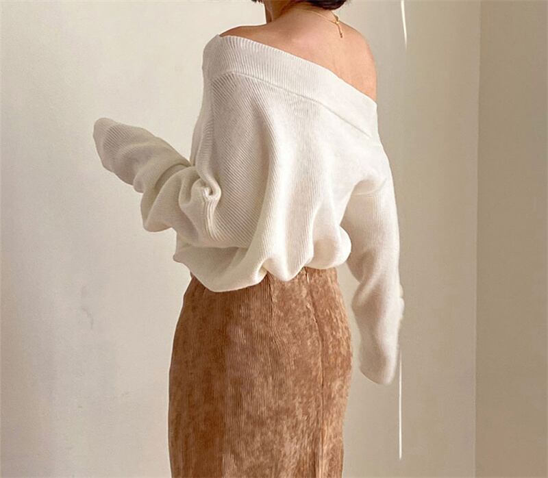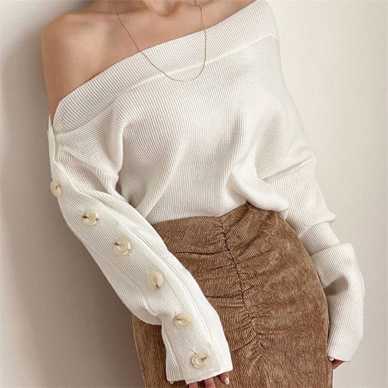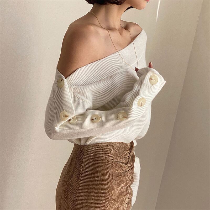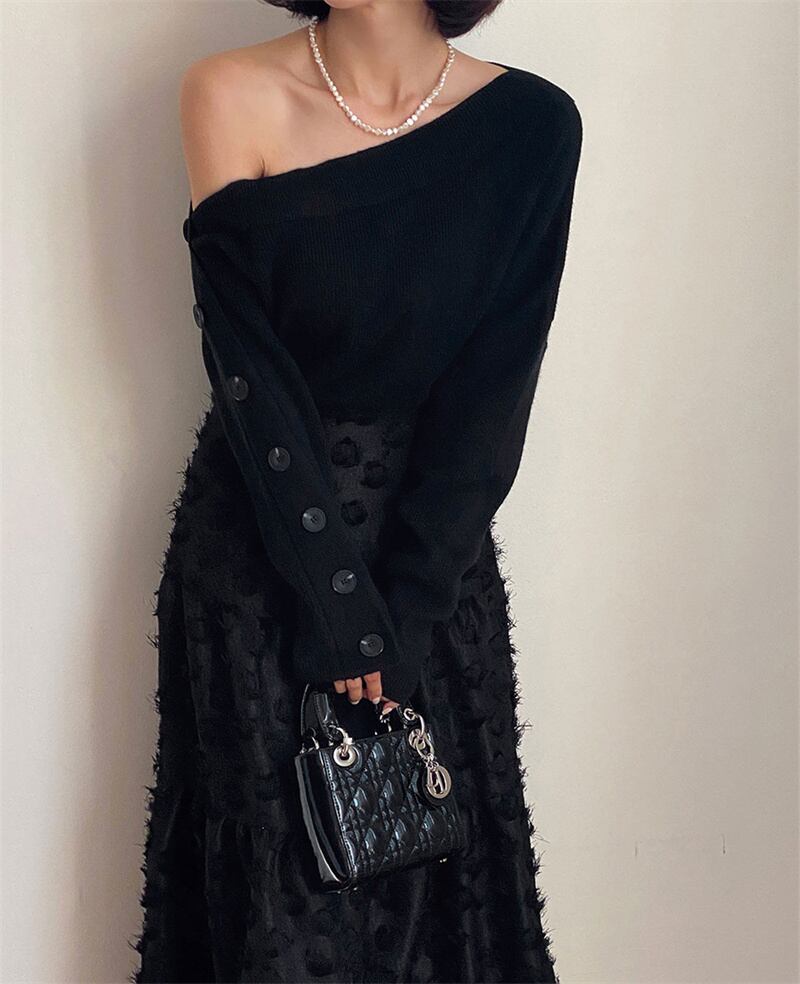 INS 秋新作 カジュアル 韓国系 ボートネック ボタン 長袖Tシャツ ニットトップス