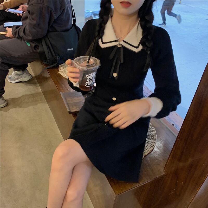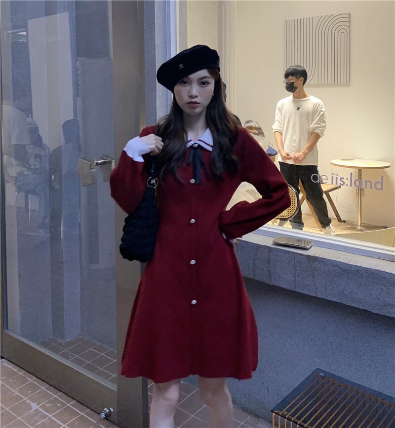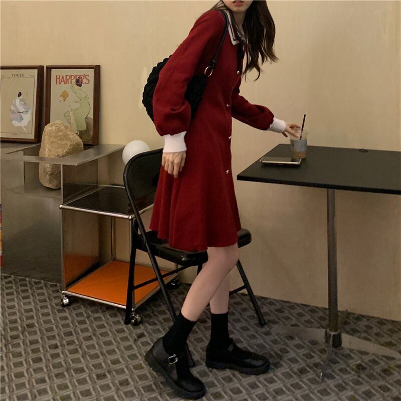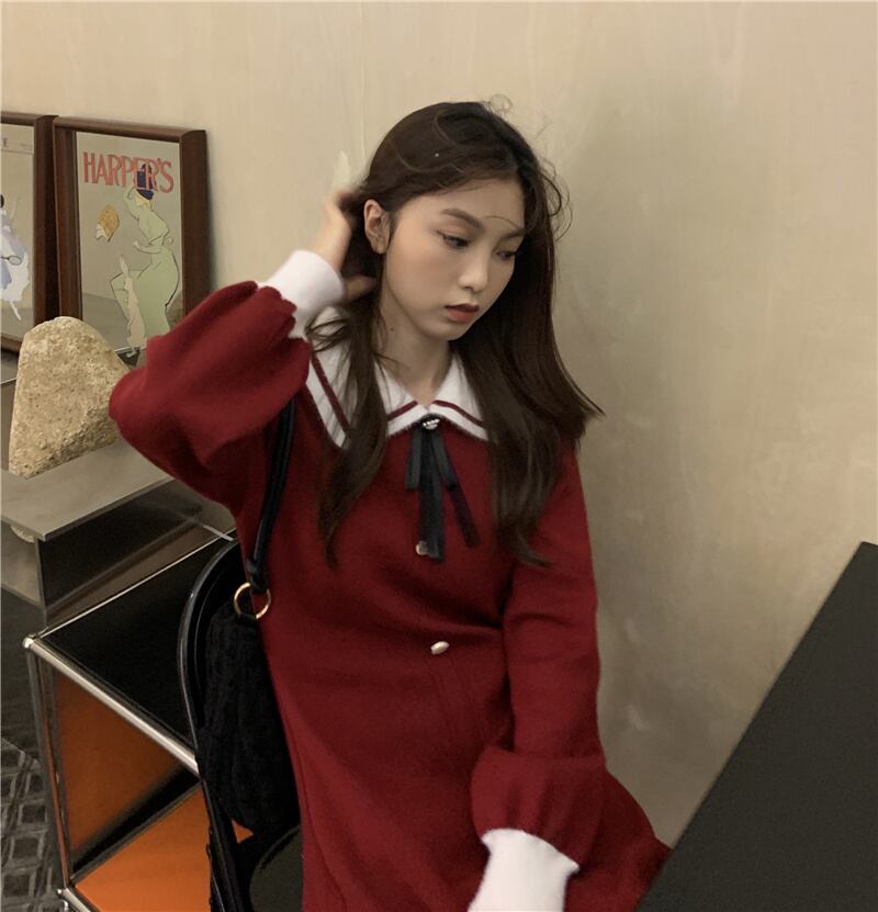 INS 秋冬新作 シンプル デザイン若く見え 折り襟 ニット ワンピース