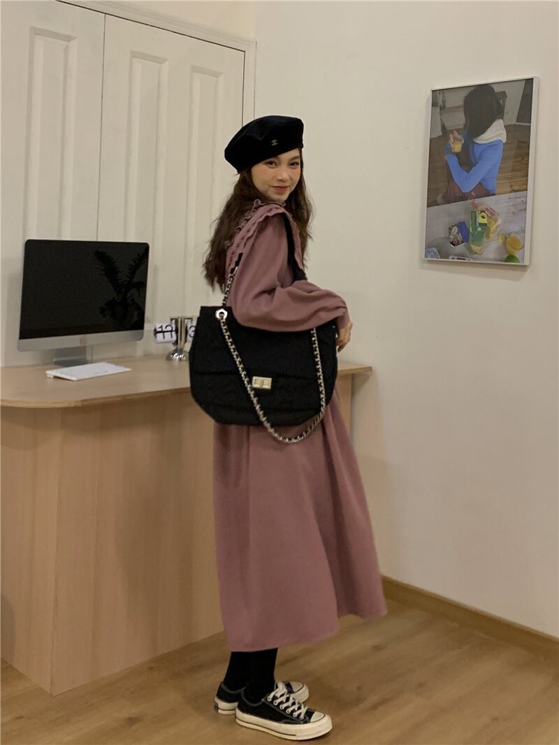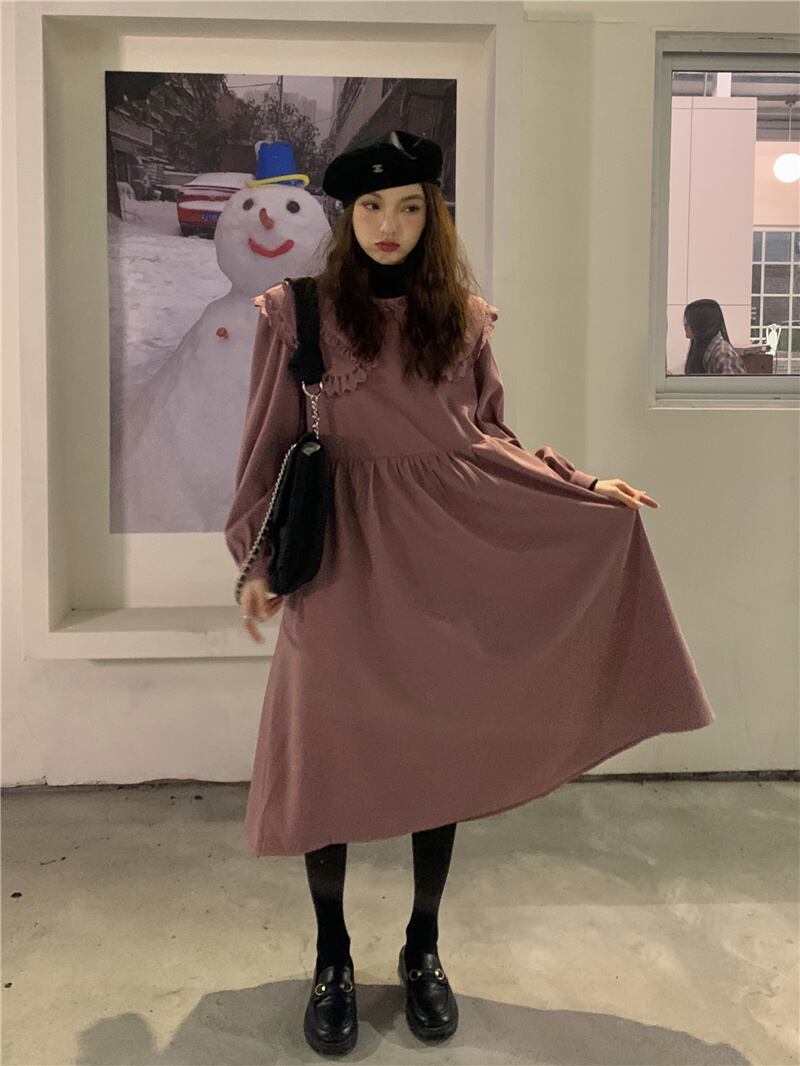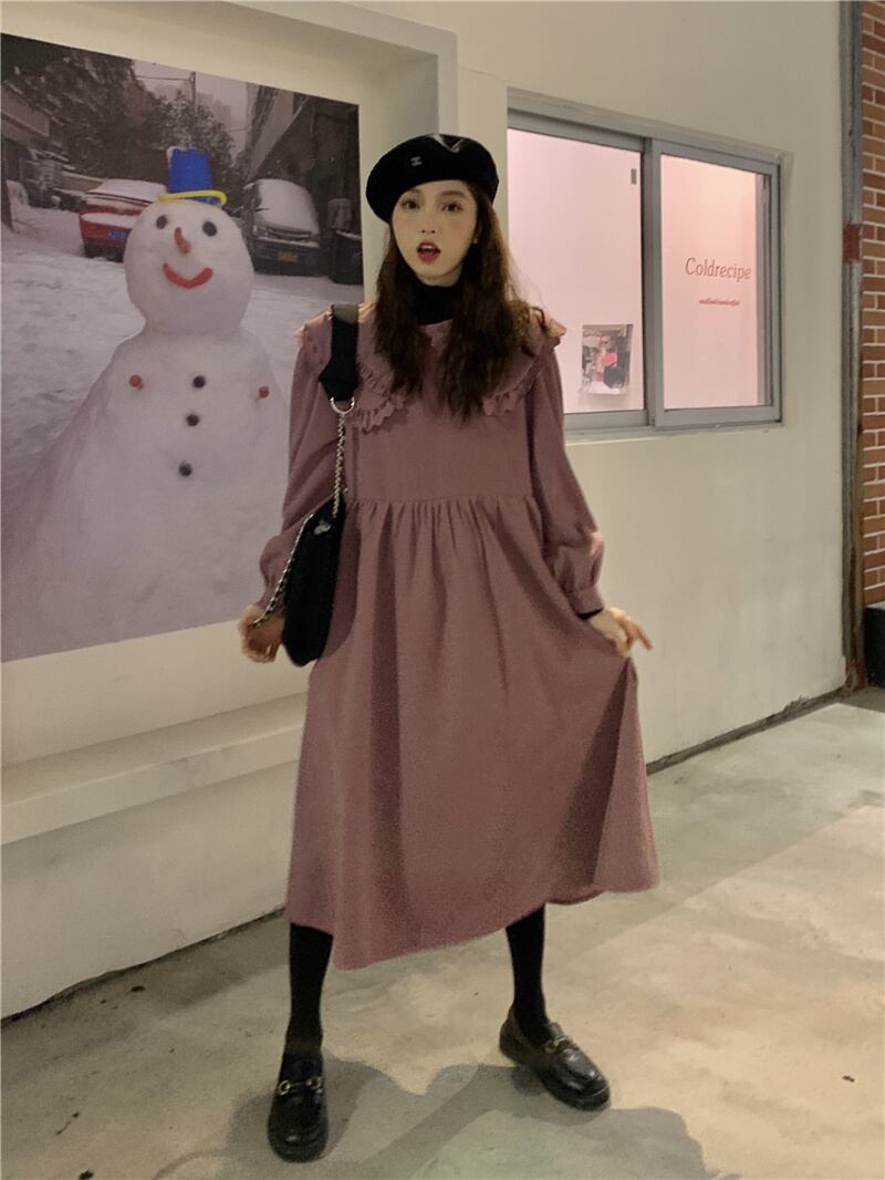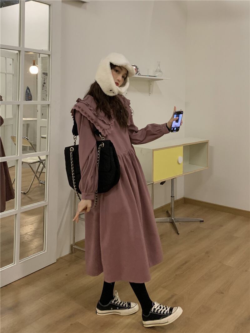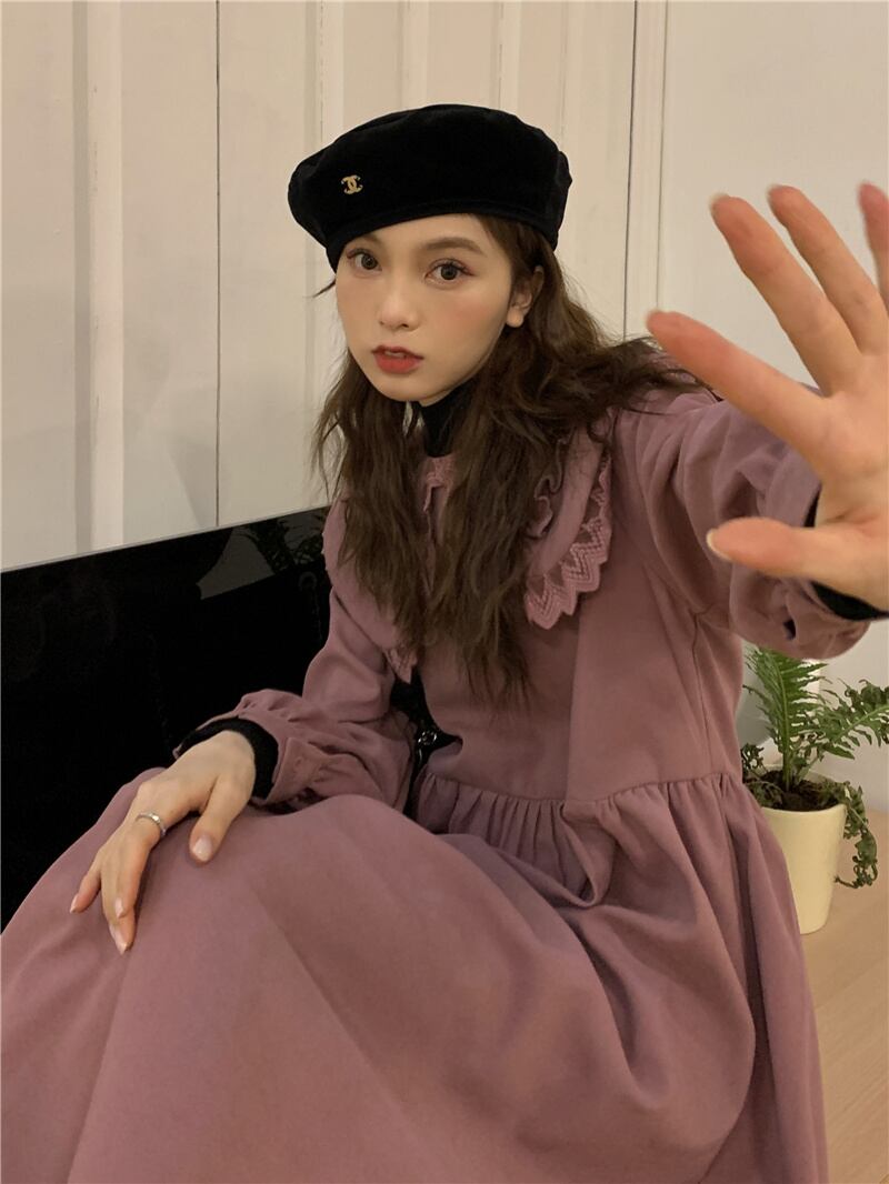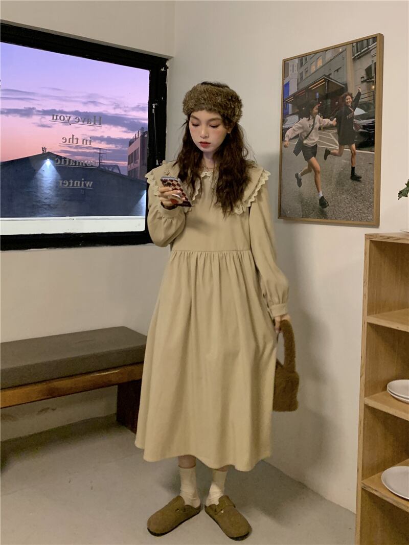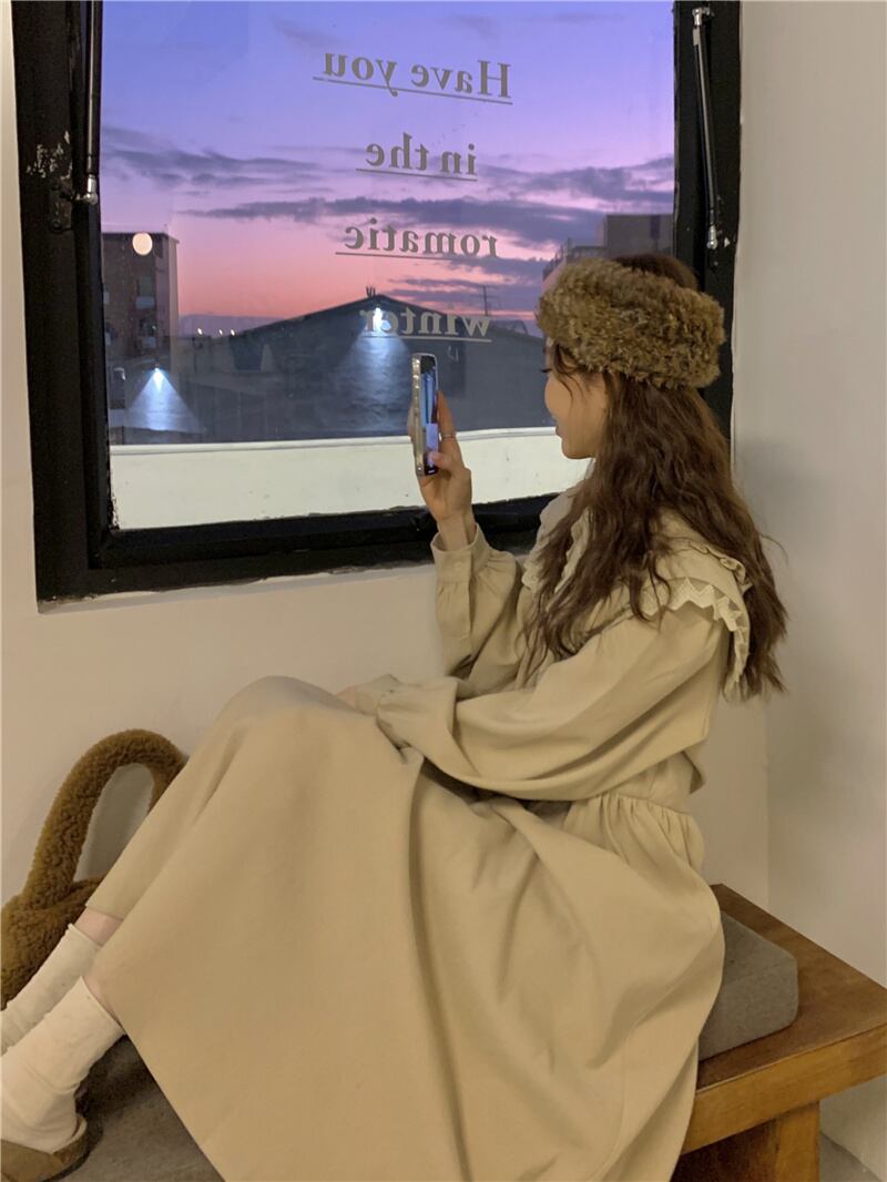 INS 秋新作 カジュアル 韓国系 折り襟 長袖 レース飾り ゆったり ロングワンピース