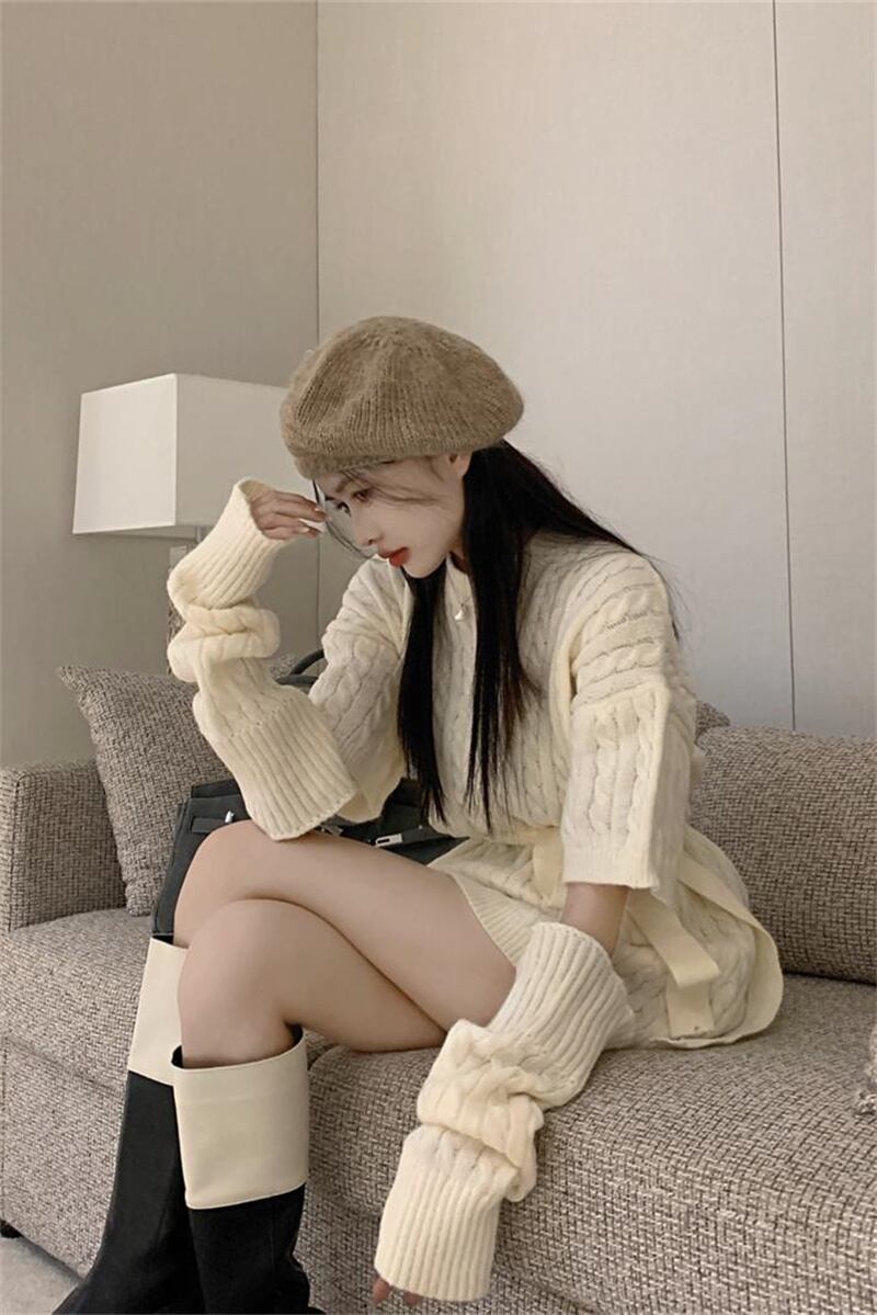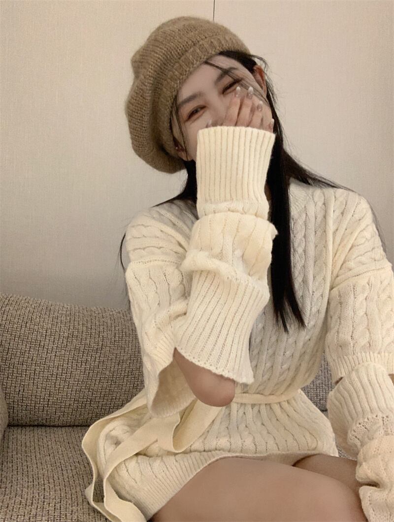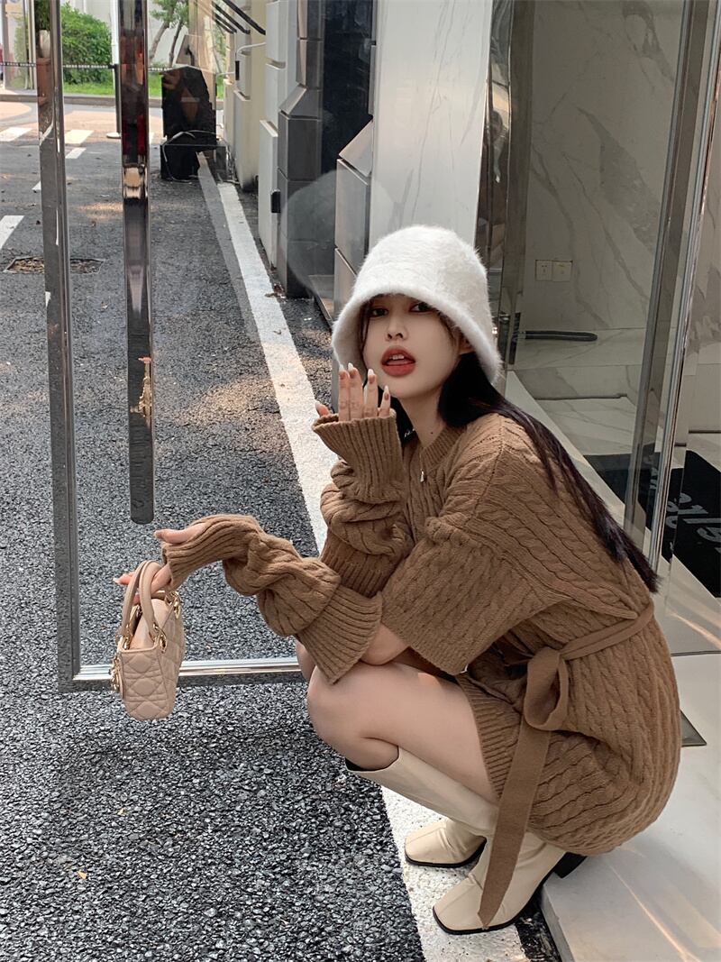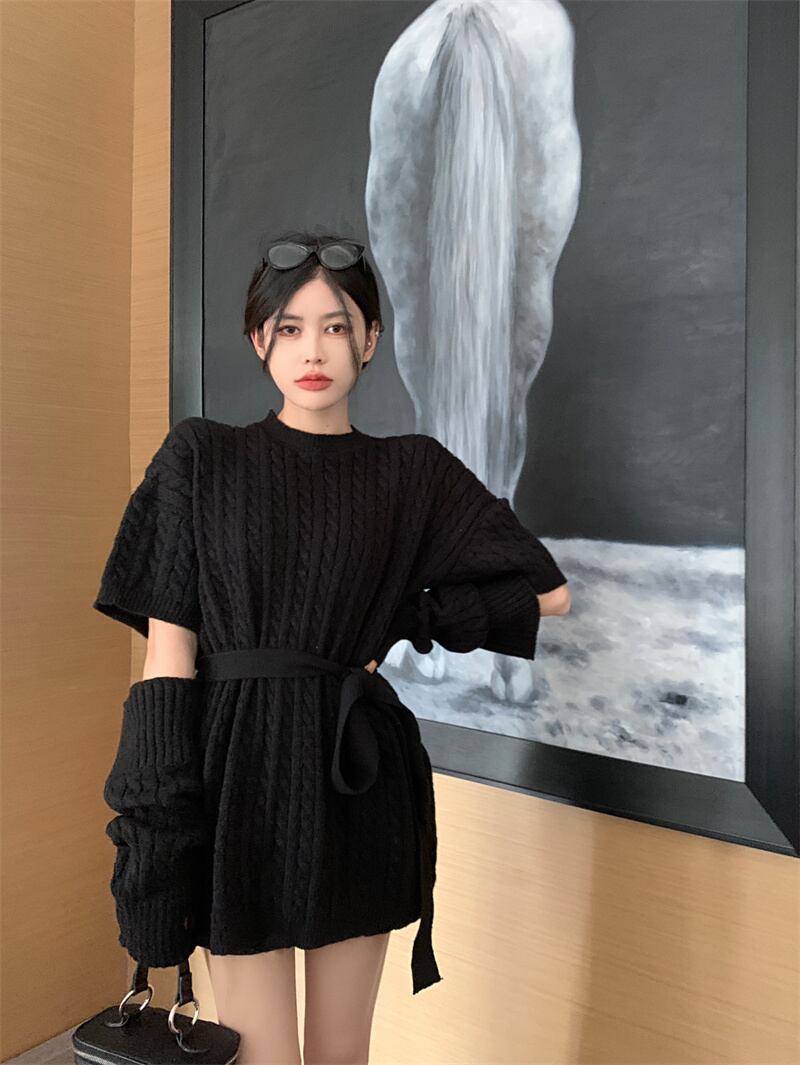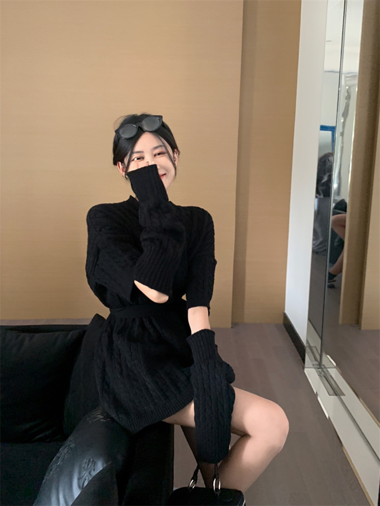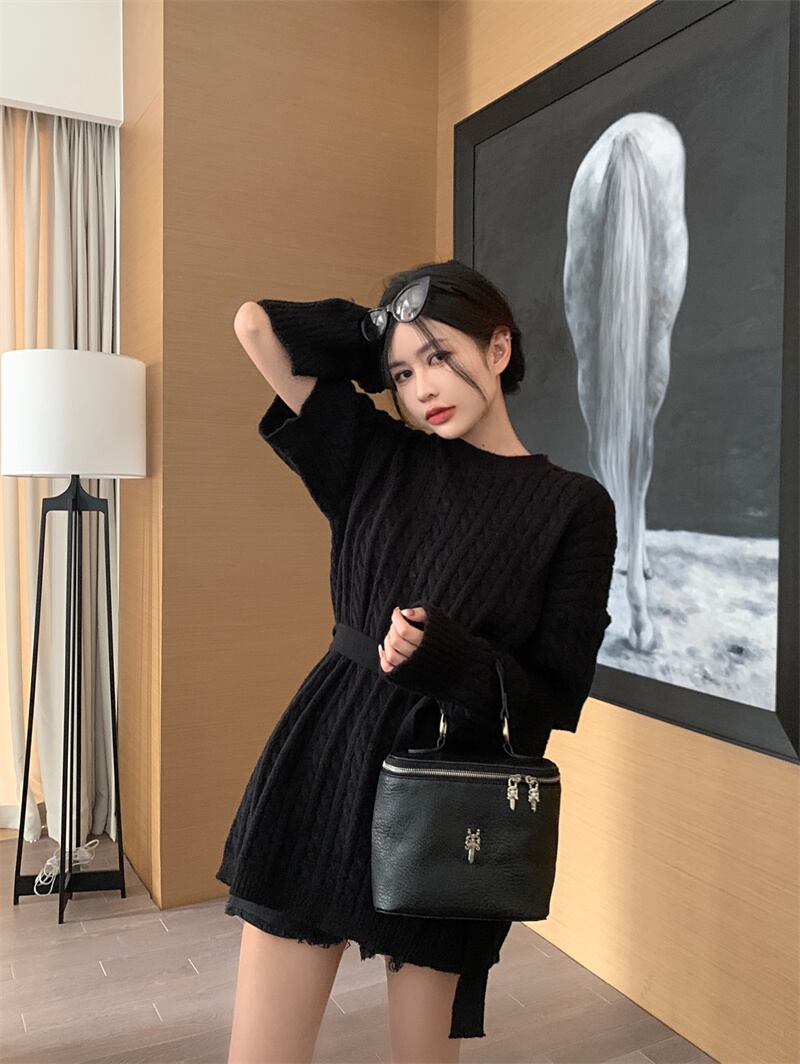 INS 秋新作 カジュアル 韓国系ツイスト模様 長袖セーター シンプルベルトハイ ワンピース