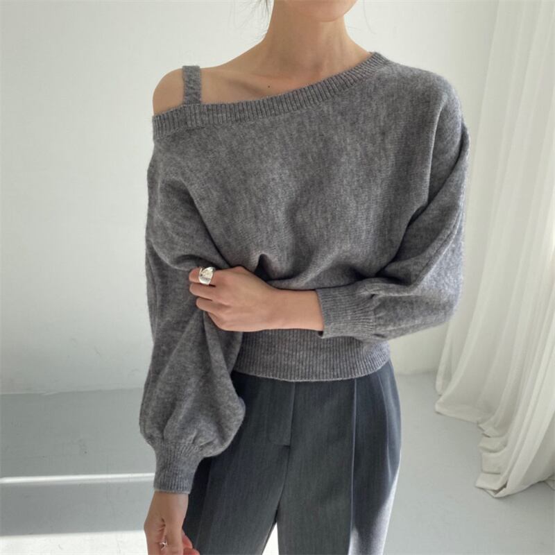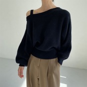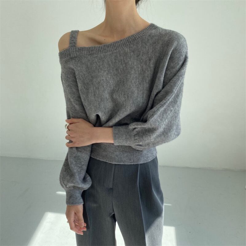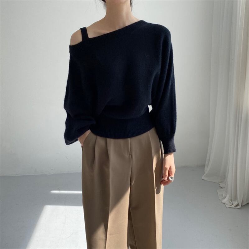 INS 秋新作 カジュアル ニット生地 オフショルダー ラウンドネック プルオーバー セーター/カットソー