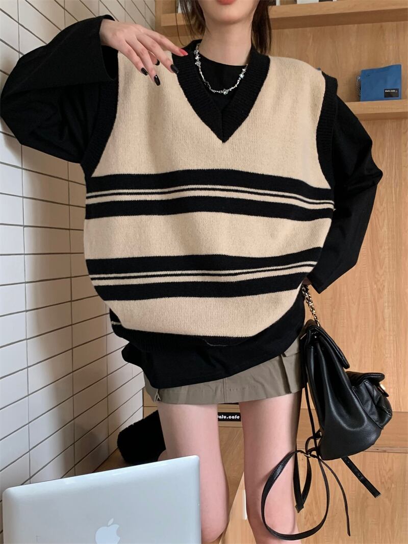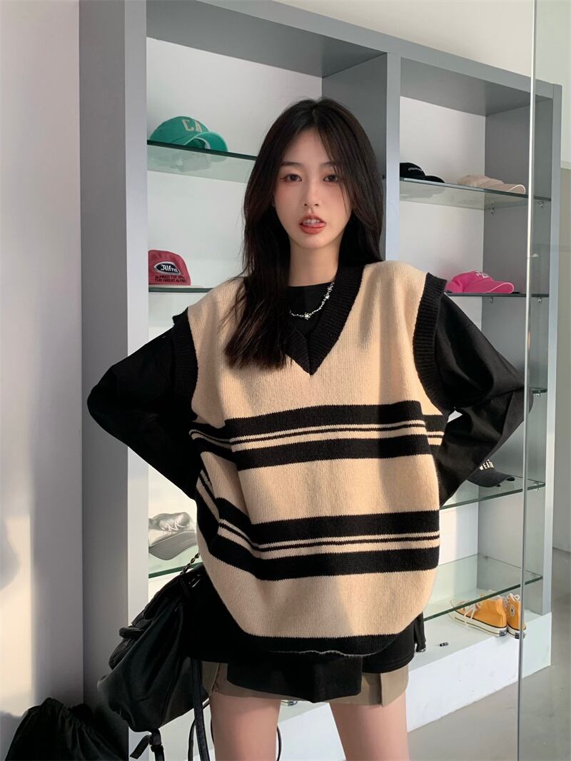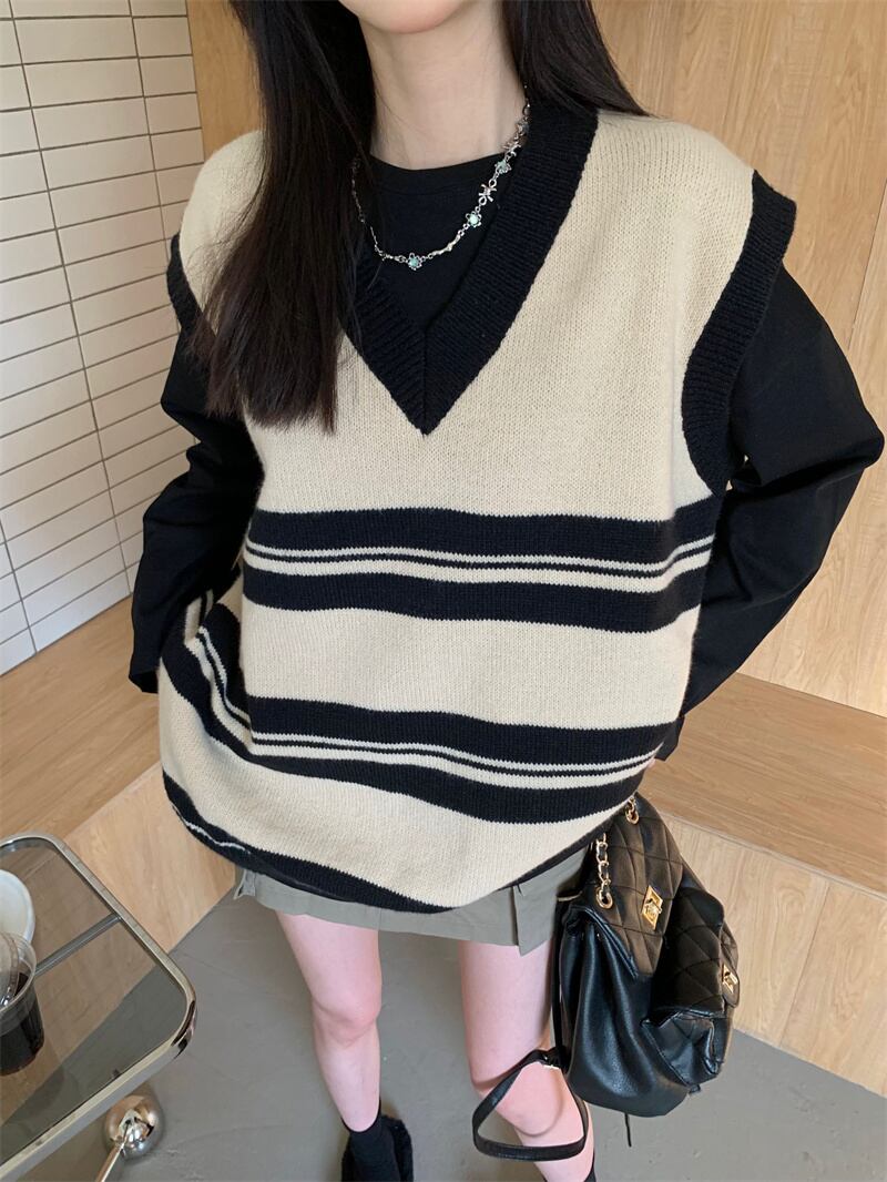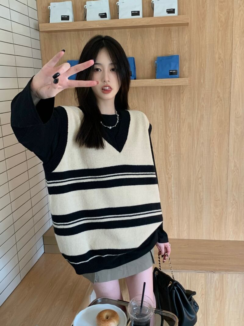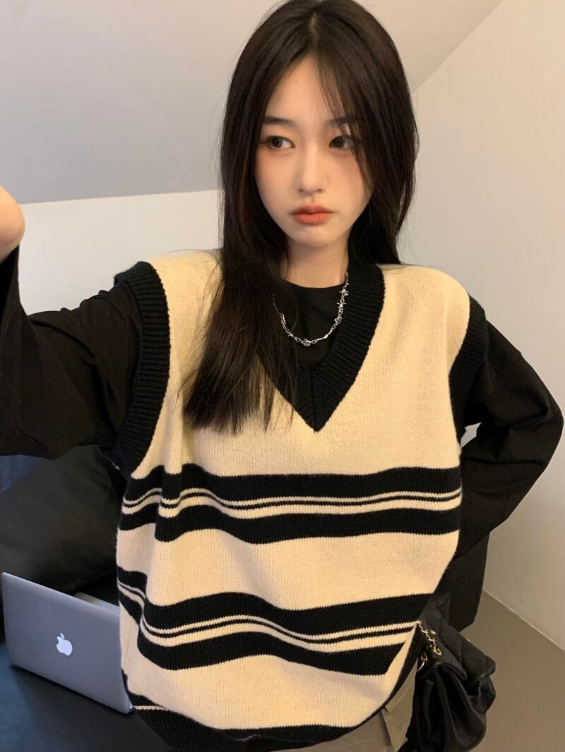 INS 秋新作 超人気 韓国系 Vネック ストライプ 柄 レトロ ベスト