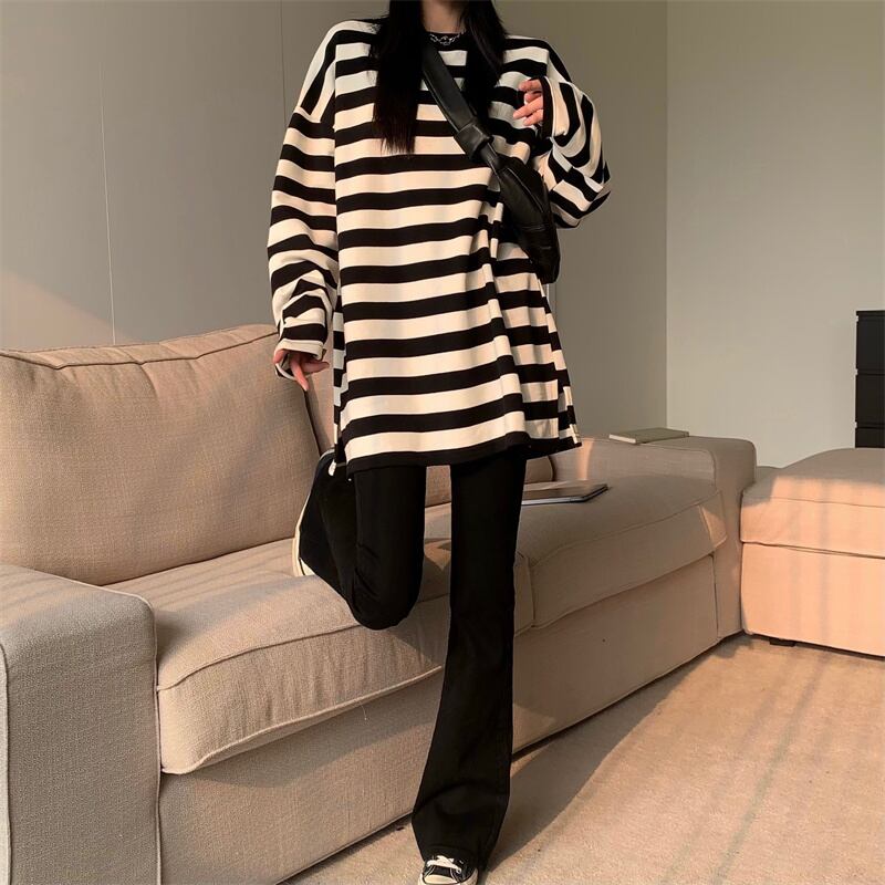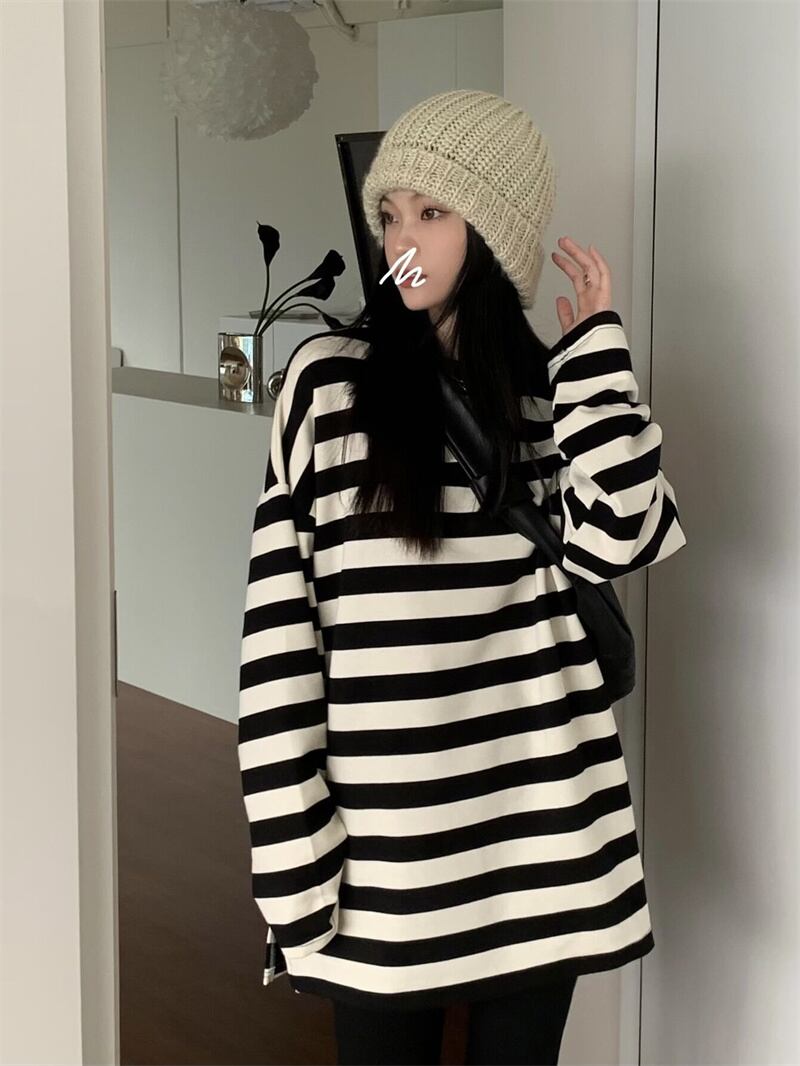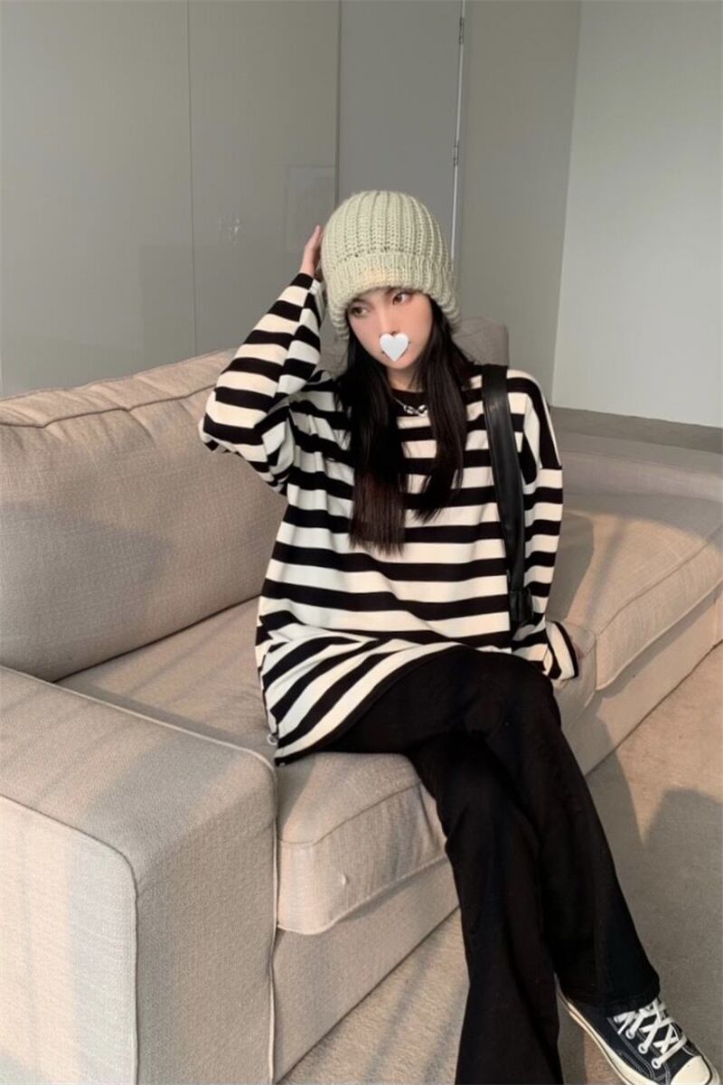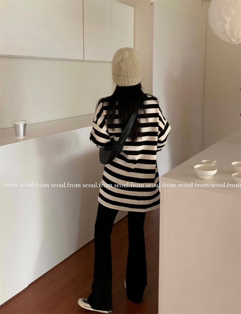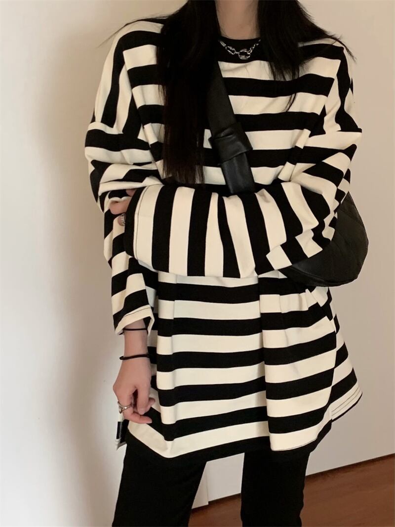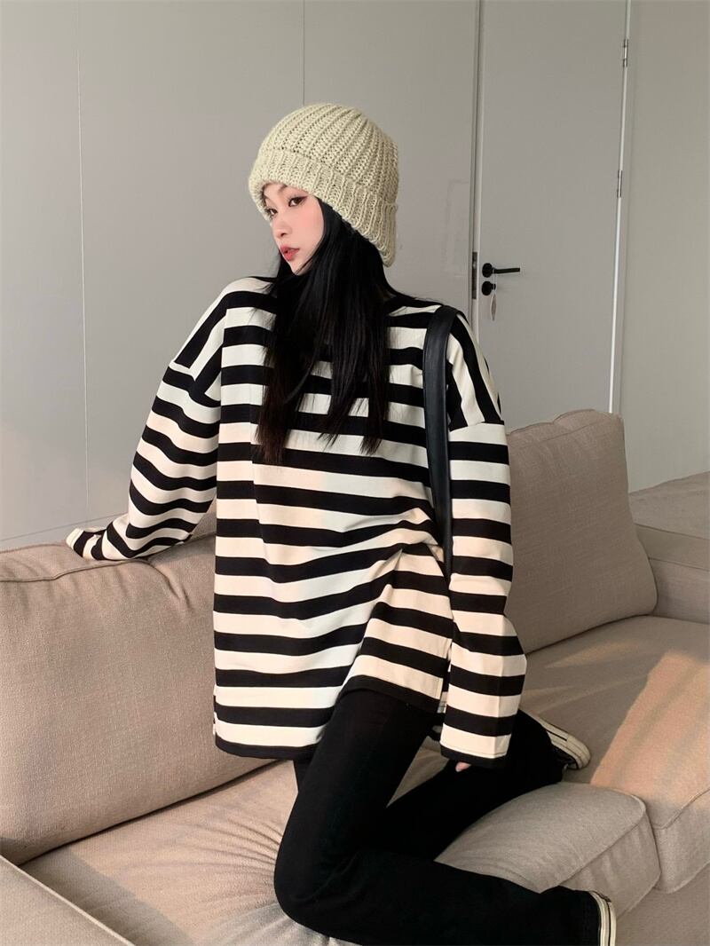 INS 秋新作 超人気 韓国系 シンプル ストライプ 柄 ラウンドネック 長袖 Tシャツ