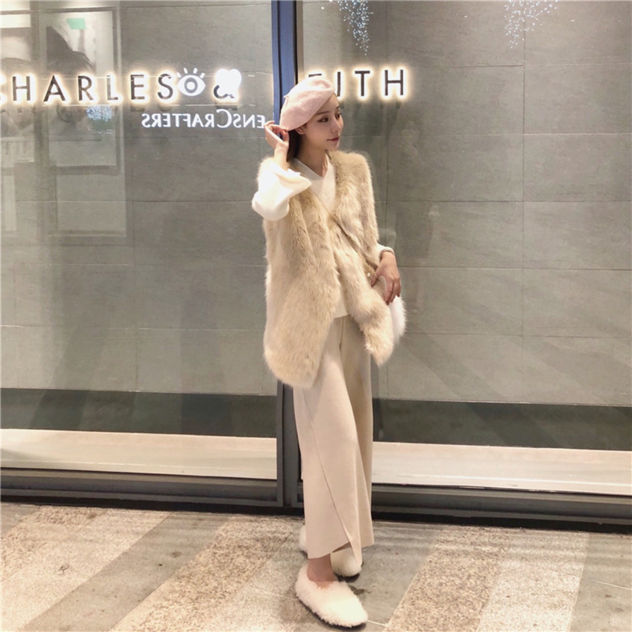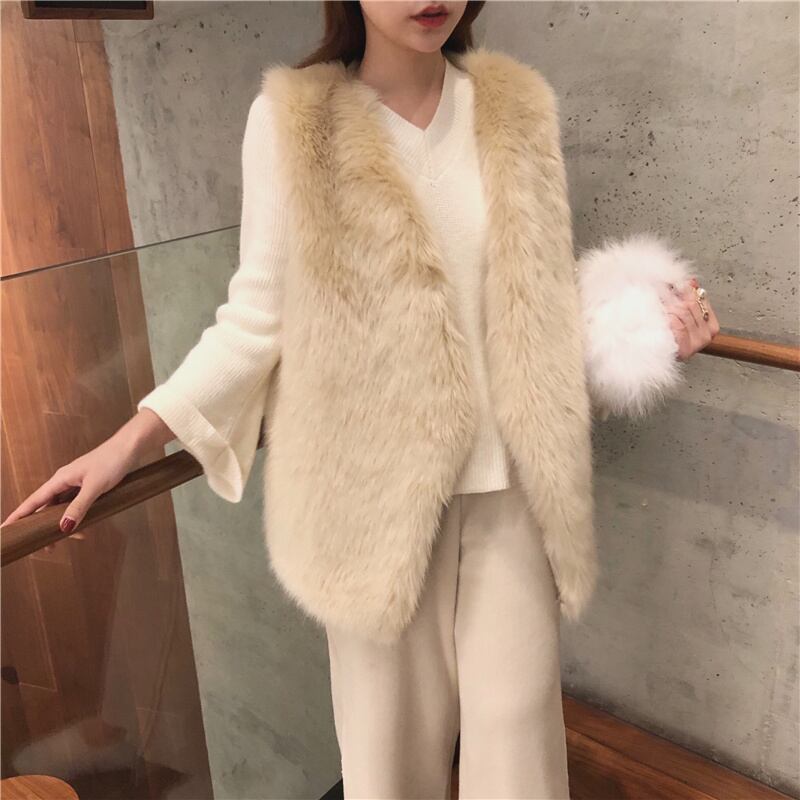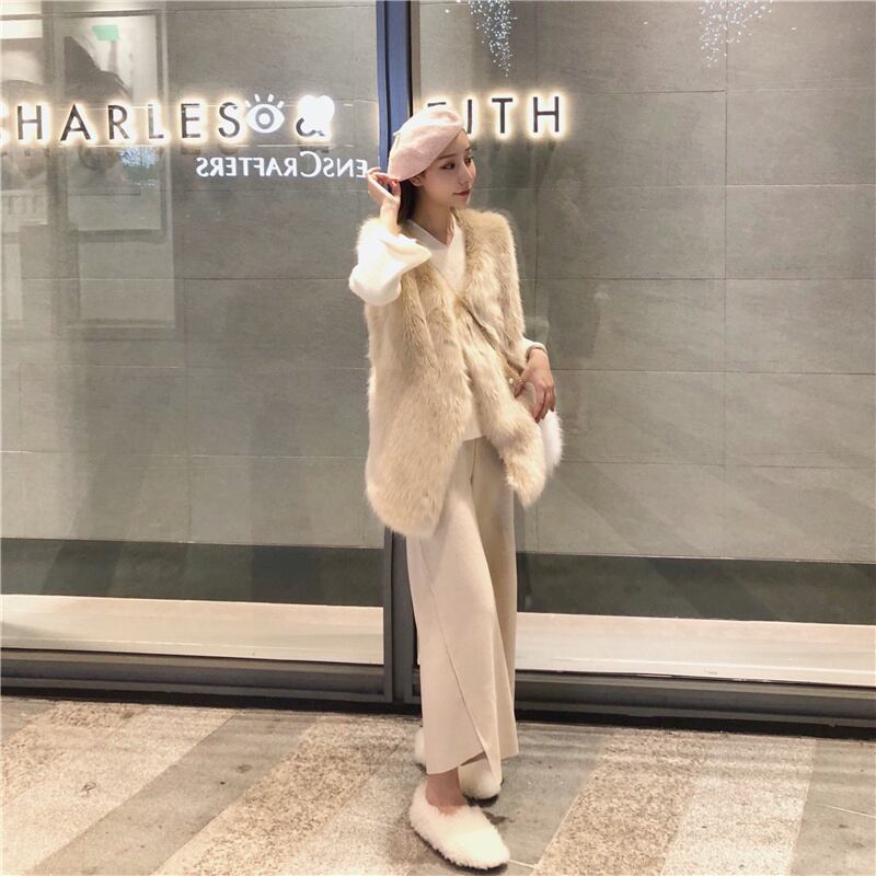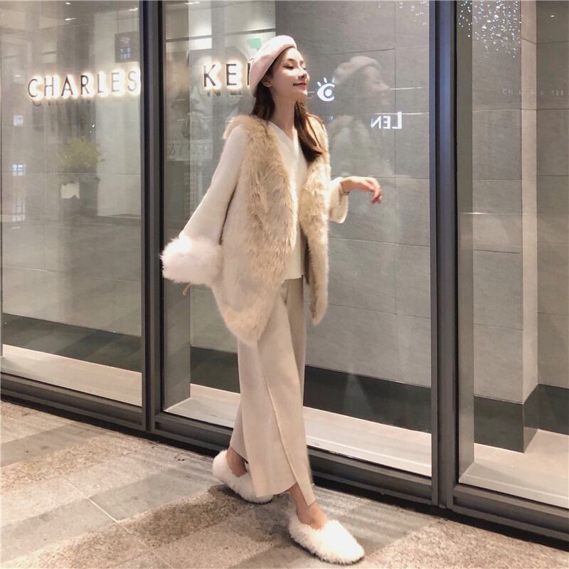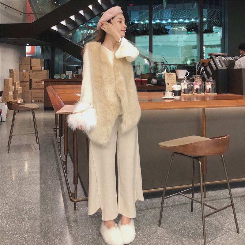 INS 秋新作 レトロ 模造ミンクベスト/Vネック長袖セーター/ワイドパンツ