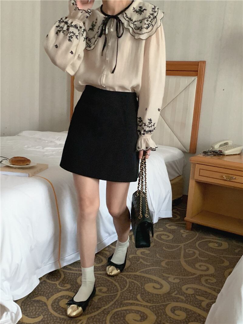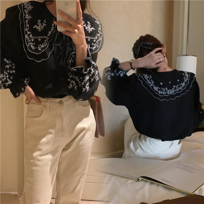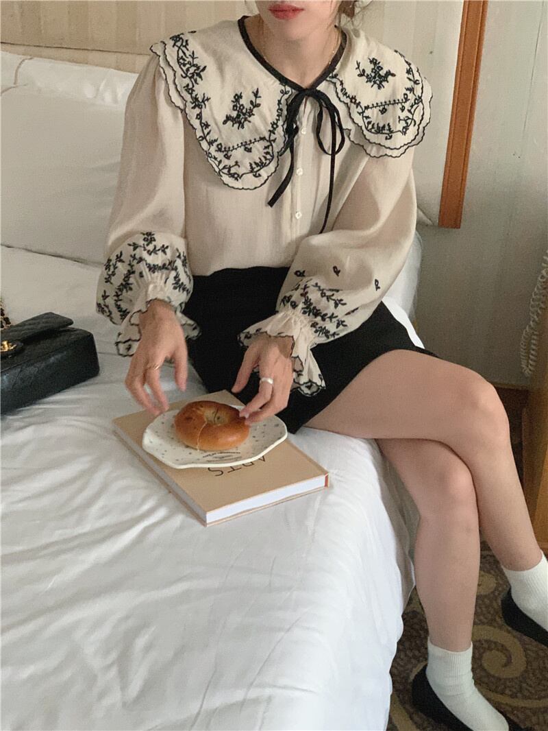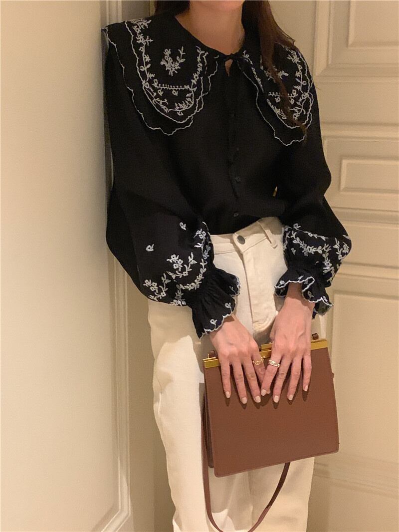 INS 秋新作 超人気 ファッション レトロ 気質 折り襟 刺繍 シャツ/ブラウス