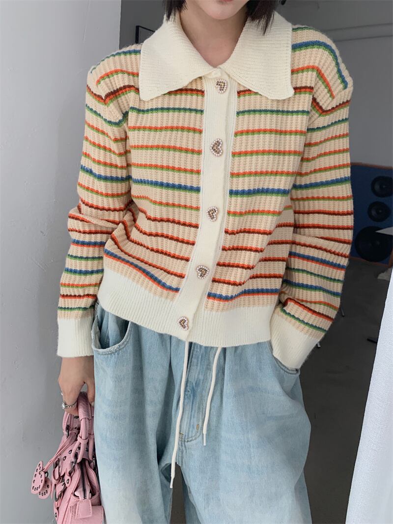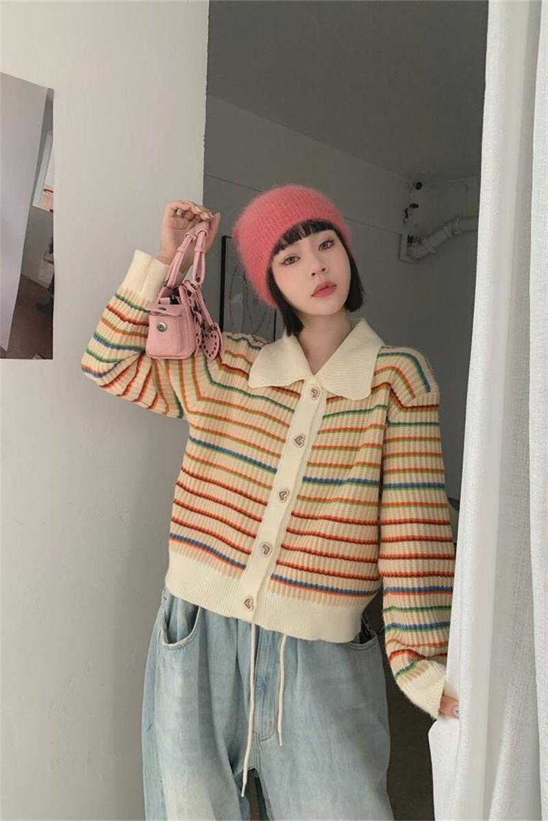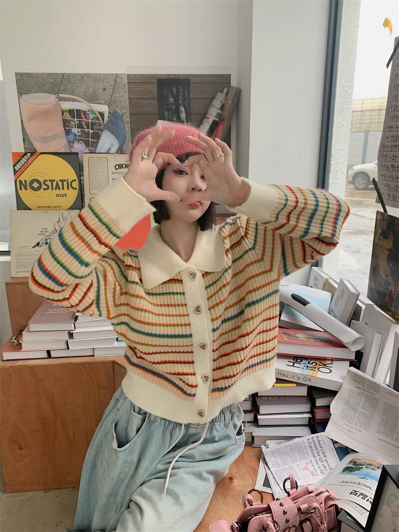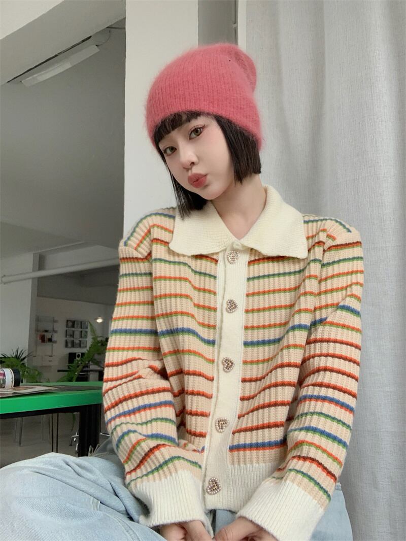 INS 秋新作 超人気 韓国系 ストライプ 柄 折り襟 ニット セーター