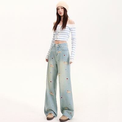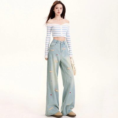 デニムかっこいいスラックスパンツシンプルカジュアル 25 ダックスフント ワイドパンツ デニムパンツ 刺繍 ハイウエストゆったり見えやせ パンツ レディース