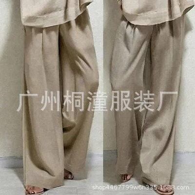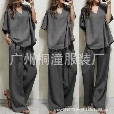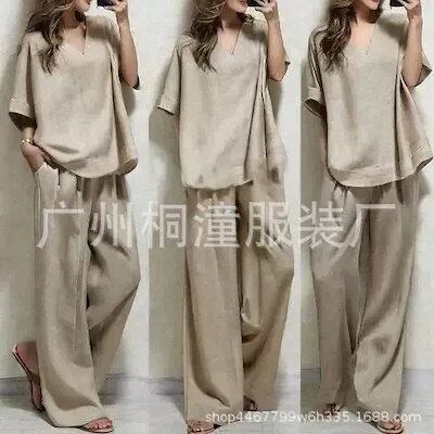 大人 オシャレ 2点セット ハーフ袖トップス ウエストのタイとサイドポケット付きワイドパンツ + Vネック ゆったり レディース セットアップ