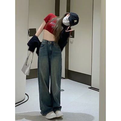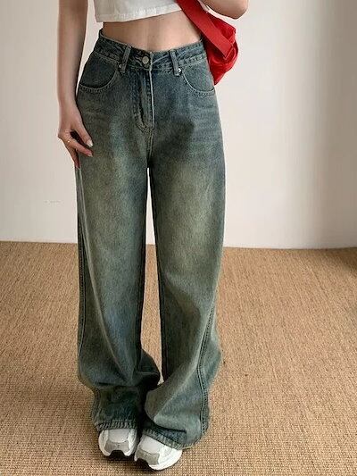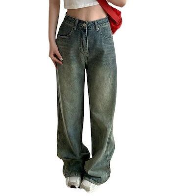 韓国風 レトロ ハイウエスト デニム レディース 夏 ゆったり ヒップ カバー 痩せ見え ワイドレッグ ストレート パンツ