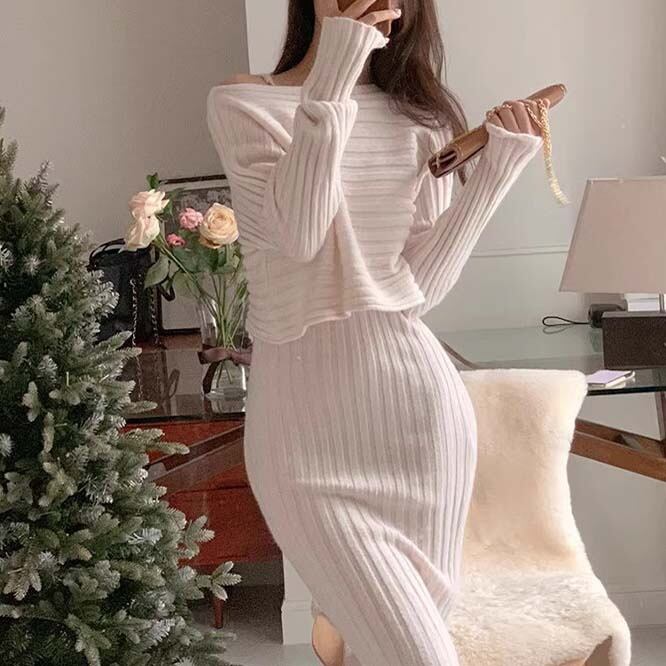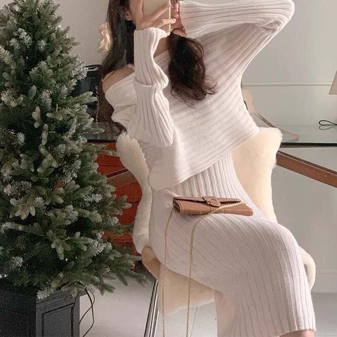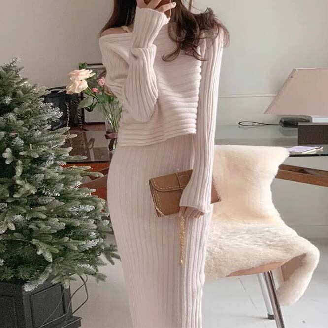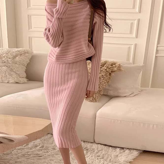 【秋新作】韓国風レディース服 秋 エレガント 無地 カジュアル きれいめ ニットセットアップ