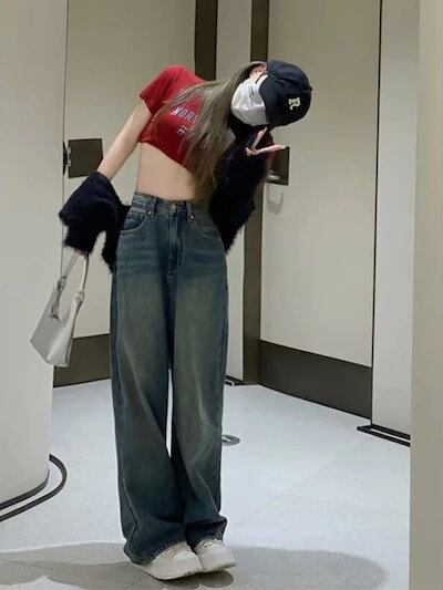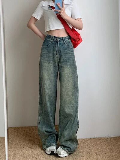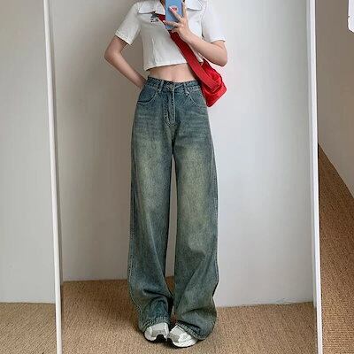 韓国風 レトロ ハイウエスト デニム レディース 夏 ゆったり ヒップ カバー 痩せ見え ワイドレッグ ストレート パンツ