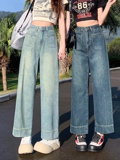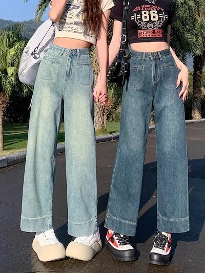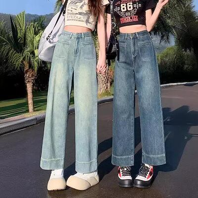 ビッグサイズ レトロ ライト カラー デニム レディース 夏 ハイウエスト 痩せ見え ゆったり 低身長 ストレート ワイドレッグ ロングパンツ