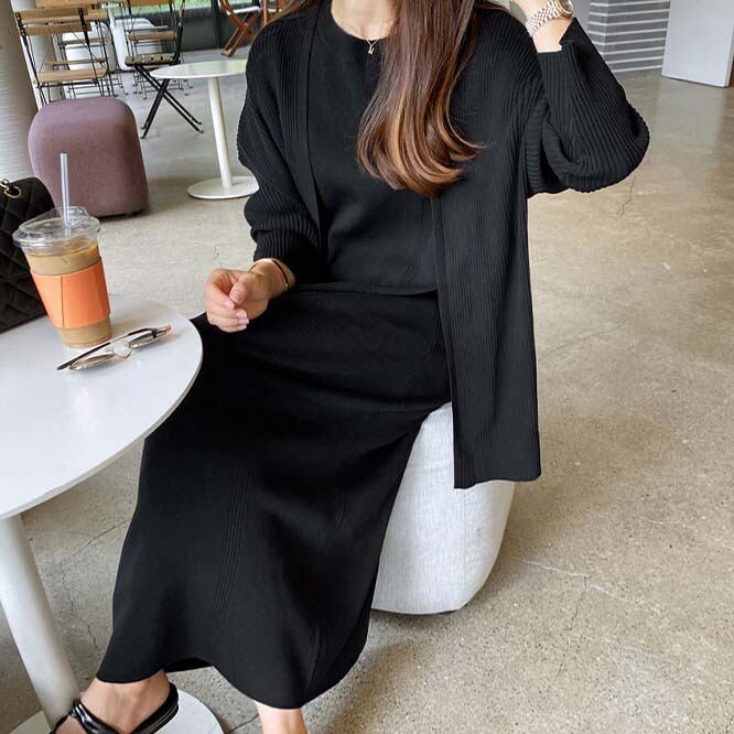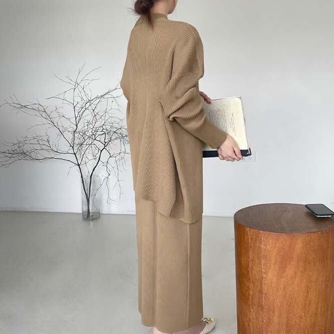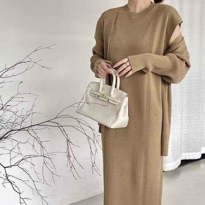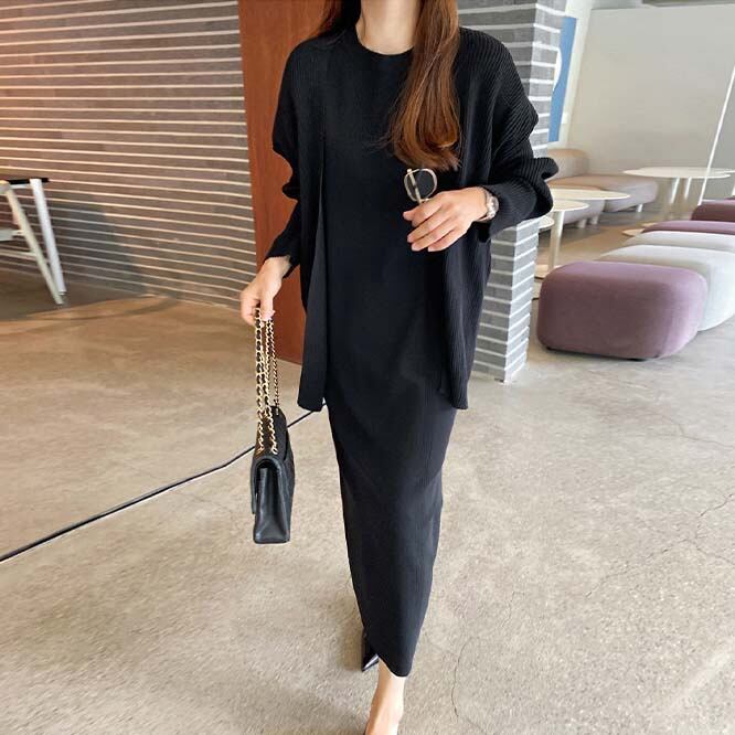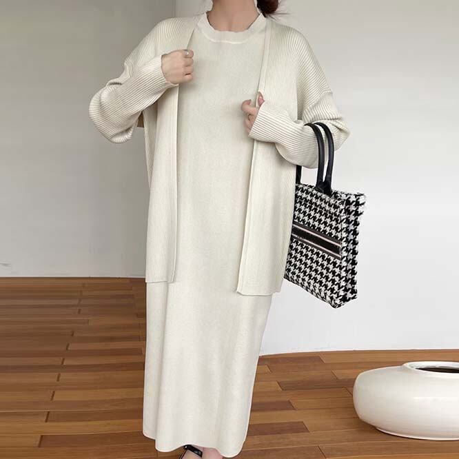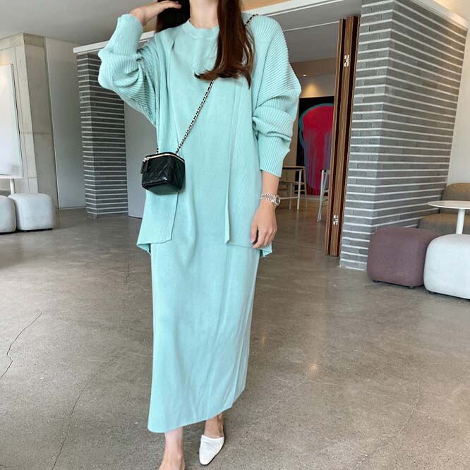 【秋新作】韓国風レディース服 秋 ゆったり 無地 カジュアル きれいめ ニットワンピース&コート セット