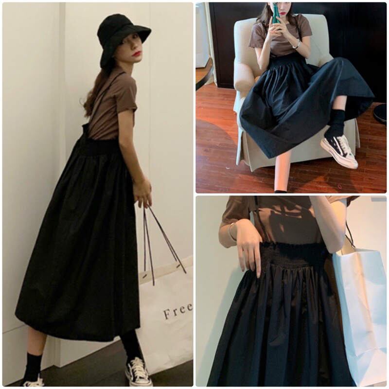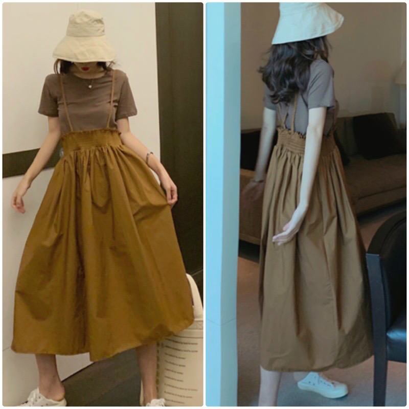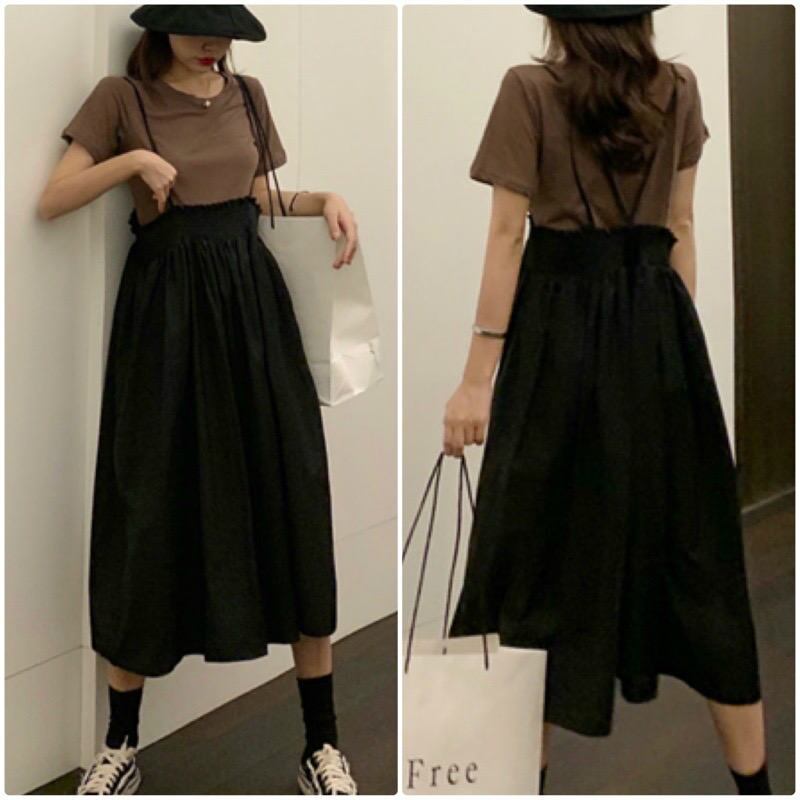 レディースセットアップ上下セット半袖Tシャツカットソーサスペンダースカートミモレ丈フレア無地春夏カジ