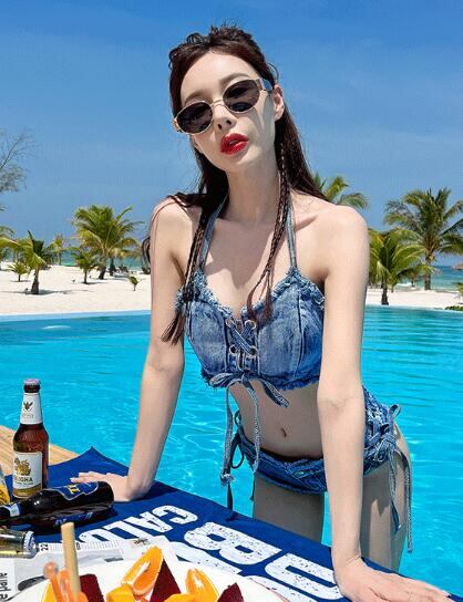 水着 温泉可用 女子ビキニ三角 セバレーツ デニム水着 バストアップカバーアップ水着 2点セット