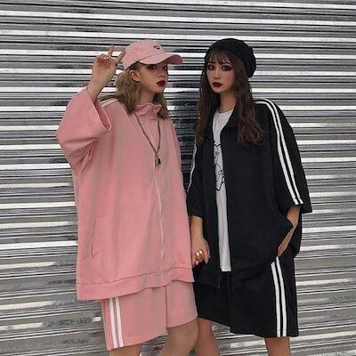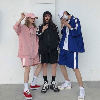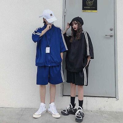 ジャージメンズ七分袖男女兼用ランニング春夏レディース2本ライン運動着パーカーハーフパンツストリート上下セットジムウェア大きいサイズゆったりトレーニングウェアセットアップ吸汗速乾部活