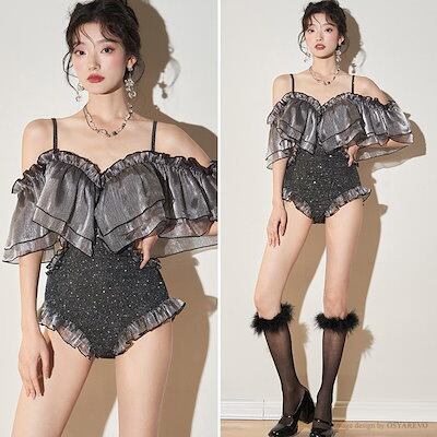 限定セール!水着 レディース ワンピース 体型カバー ワンピース水着 ホログラム モノキニ水着 ティアードフリル パールストラップ 可愛い 水着レディース レディース水着