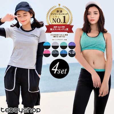 フィットネス水着 レディース セパレート 体型カバー水着 長袖ラッシュガード かわいい ママ水着 ミセス 30代 40代 20代 50代 60代 ぽっちゃり サーフパンツ ラッシュレギンス付き 4点