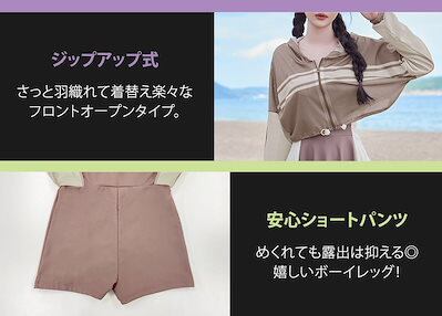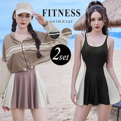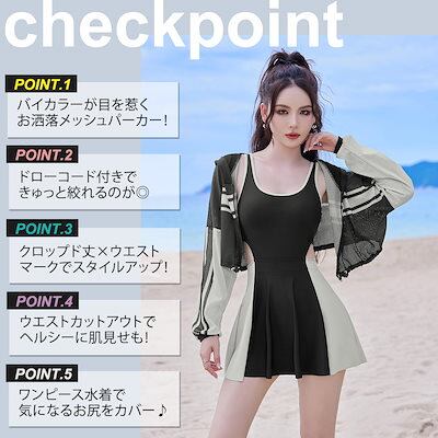 フィットネス水着 レディース 体型カバー水着 ワンピース オールインワン クロップド丈 パーカー 長袖 メッシュ トップス 2点セット ドローコード 裾 フレア サイドカットアウト 二の腕 ウエスト