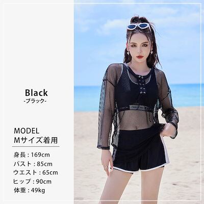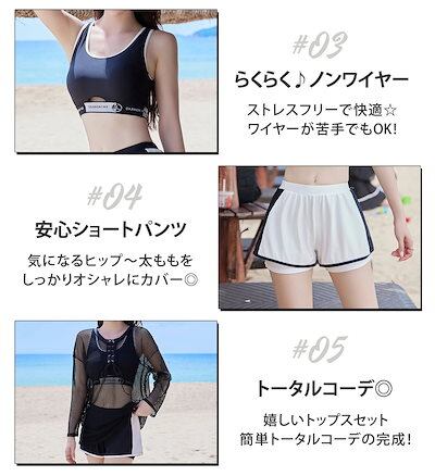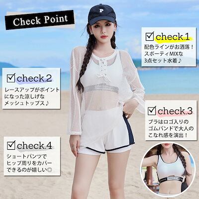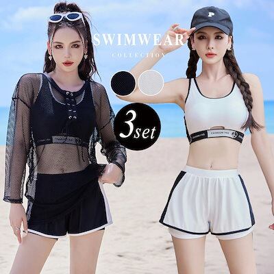 タンキニ 水着 レディース 体型カバー水着 3点セット 20代 30代 40代 ママ水着 長袖 配色 カラーブロック メッシュ素材 オーバーサイズ ビッグシルエット ロゴ レースアップ スポーティー