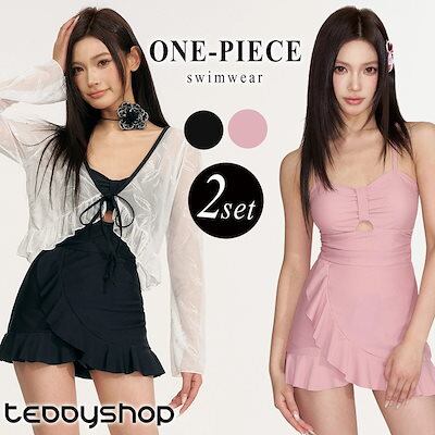 水着 ワンピース 体型カバー オールインワン レディース ボレロ 2点セット フリル シアー メッシュ 長袖 リボン カットアウト ウエストマーク パッド付き ショートパンツ一体型 ノンワイヤー 二の