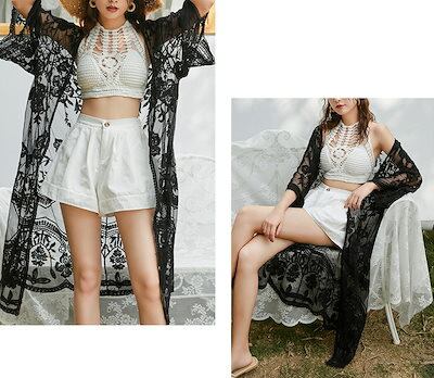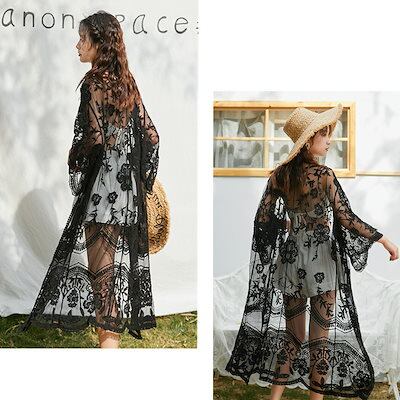 カーディガン ガウン レディース マキシ丈 クロシェ ロングカーデ レース 透け ビーチファッション 水着の上から サマーカーデ ママコーデ 薄手 長袖 羽織 体型カバー マンダリンスリーブ ゆったり