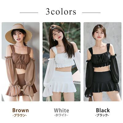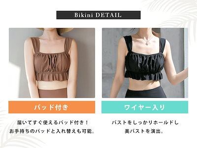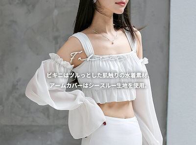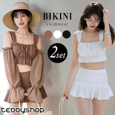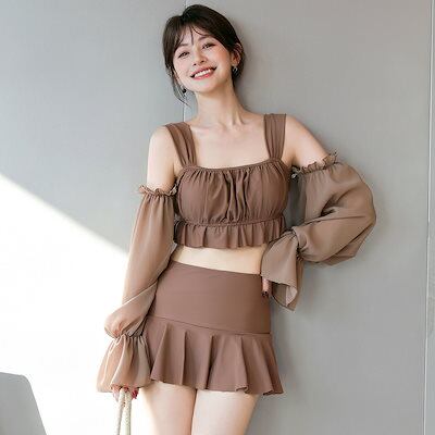 激安水着ビスチェ ビキニ 水着 レディース 体型カバー ハイウエスト 2点セット フリル ベルスリーブ オフショルダー ワイヤー入り 2way 袖 取外し 袖あり 長袖 シアー スクエアネック パット