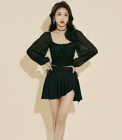 激安水着水着 レディース 体型カバー水着 2点セット 20代 30代 40代 ママ水着 長袖 シースルー ふんわり スリーブ 人 ウエストマーク スタイルアップ 露出控えめ 後ろ姿 カットアウトデザイ