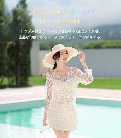 水着 ビキニ ビスチェ 体型カバー レディース スカート一体型パンツ 長袖 トップス チュニック レース 3点セット きいサイズ ノンワイヤー ツイストデザイン フレアヘム 二の腕 ウエスト ヒップ