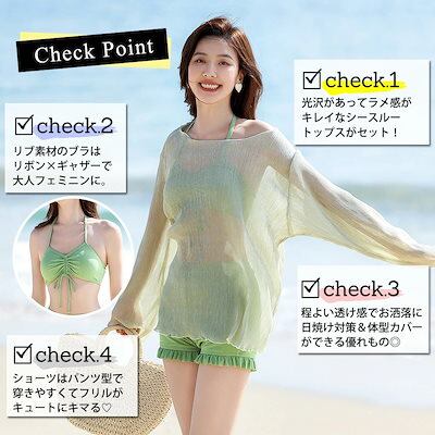 激安水着水着 レディース ビキニ 3点セット 体型カバー水着 長袖 トップス付き セパレート 可愛い 10代 20代 30代 人 無地 シンプル シースルー ラメ リブ素材 ブラ リボン ギャザー フ