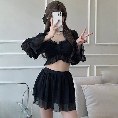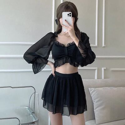 水着 レディース ビキニ 長袖 シースルー 袖つきブラ スカート ハイウエスト ショーツ かわいい ビスチェ パッド付き 二の腕 ウエスト お尻 太もも 脚 カバーアップ ガーリー ビスチェビキニ