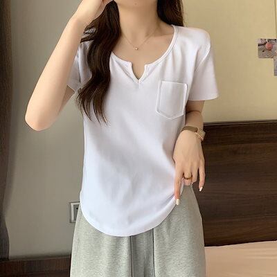 夏服 接触冷感 Tシャツ 半袖 トップス 韓国ファッション Tシャツ カットソーイレギュラーデザインvネック半袖tシャツレディーストレンディシック甘辛ショートトップス