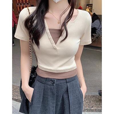夏服 接触冷感 Tシャツ 半袖 トップス 韓国ファッション Tシャツ カットソーTシャツ トップス Vネック 正肩 半袖 夏 新型 上着 スリム ショート丈 レディース 韓国ファッション | gizshop