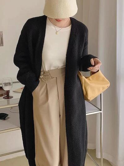 ベーシックニット 韓国ファッション 初秋新作 ニットカーディガン Vネック ロング丈ニット レディース トップス セーター ゆったり ロング丈 カーディガン 着痩せ 秋アウター レディース | gizshop