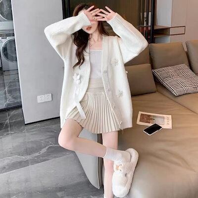 ベーシックニット フレンチ小香風コサージュセーターニットカーディガンレディースチュニックミンクフロマージュカレッジ風コートゆったりシックトップス