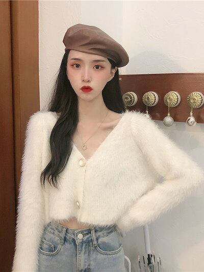 ベーシックニット ショート丈減齢Vネックニットカーディガンレディースミンクセーター秋の装いスリム長袖トップスミニコート