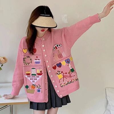 ベーシックニット 日系カートゥーンレトロ刺繍セーターコートレディース秋冬2023新作ゆったりカレッジ風減齢ニットカーディガン