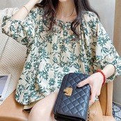 人形シャツトップ2024 夏の韓国風ルーズプルオーバーTシャツスウィートランタンスリーブ花柄コットンシャツ女性