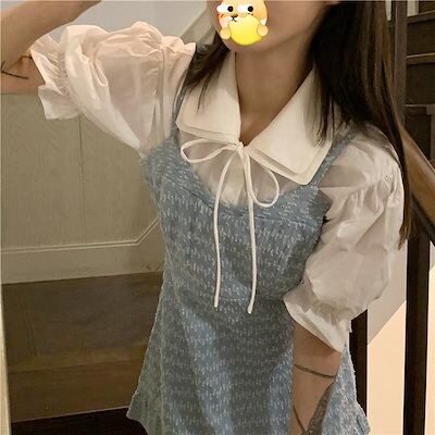 バブルスリーブデニムシャツブルードレス レディース偽のツーピースAラインショートスカートの夏2024新しいシニア感覚