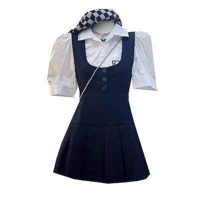2024夏新作涼しく楽ちんセットアップ韓国版カレッジ風ストラップワンピース女性海外ファッション白シャツツーピーススーツ