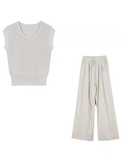 ソルトシステム ライトマチュアスーツレディースサマーニット半袖Tシャツハイウエスト細身ワイドパンツファッショナブルな2点セットタイド